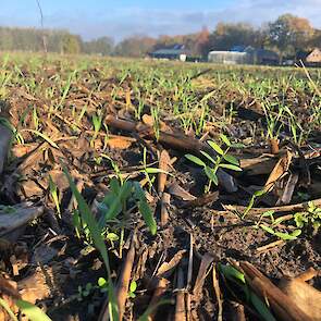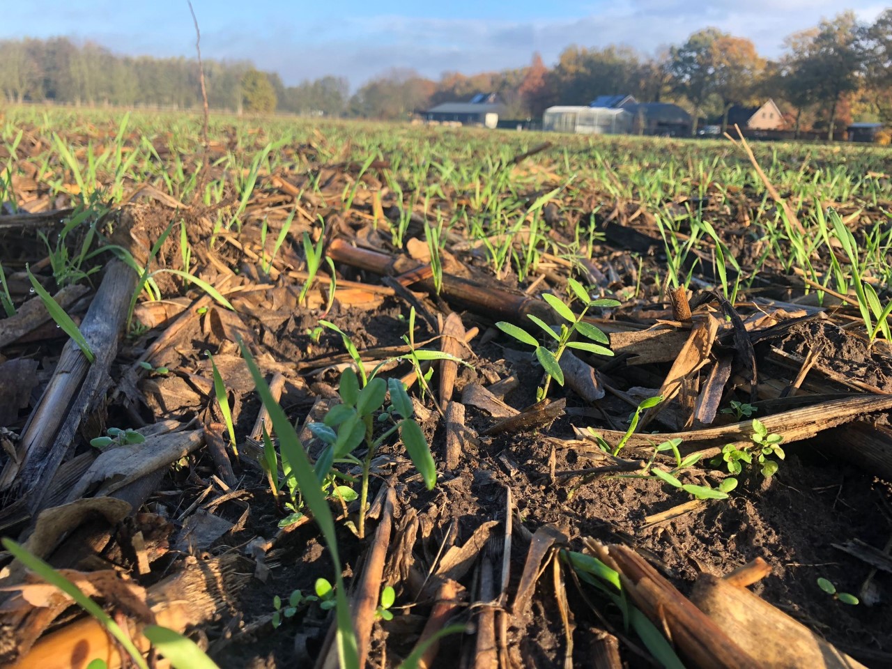 Op dit perceel in het Limburgse Melderslo is een groenbemestermengsel van Agrotechnics gezaaid. Twee weken later lijkt de opkomst al veelbelovend. Ook is de vertering van de stoppel al goed in gang gezet.
