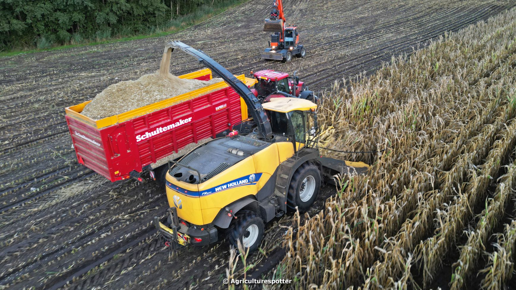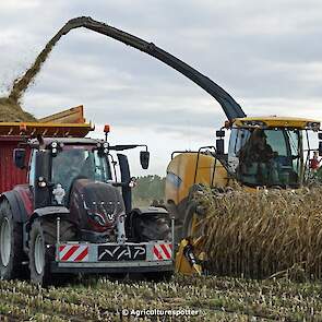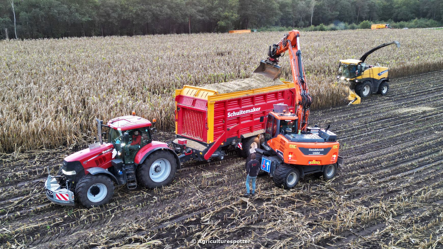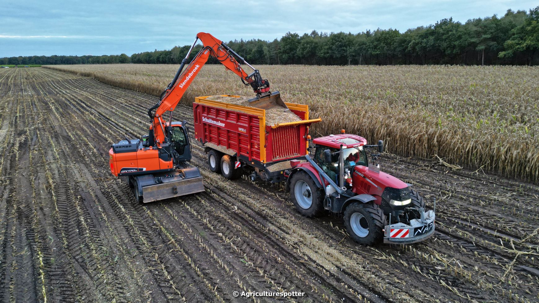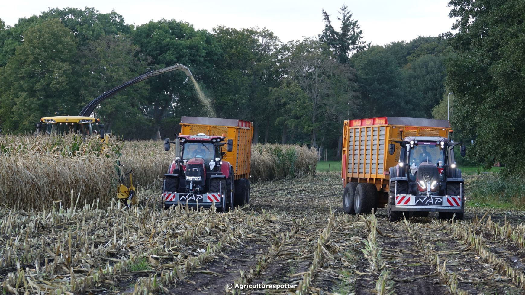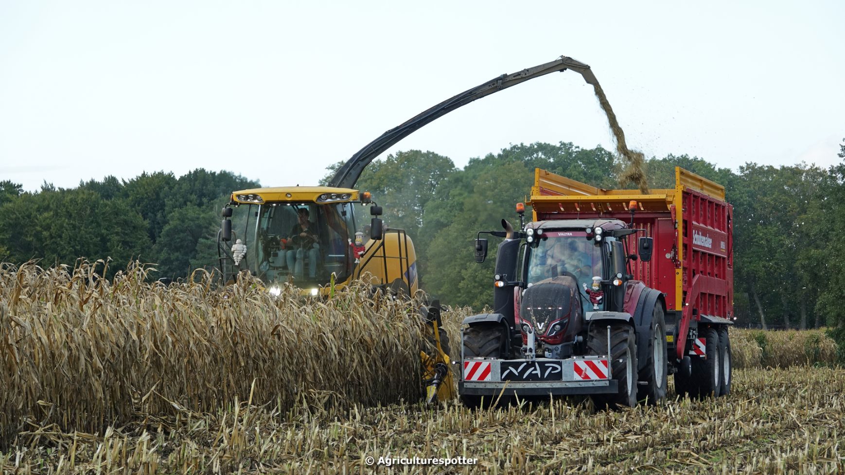 Maïs hakselen in de avonduren in Uddel (GD) met een New Holland FR600 van Loon- en Grondverzetbedrijf Nap VOF uit Ede (GD). Het transport werd gedaan met verschillende Case IH Puma's en Valtra's met Schuitemaker- en Veenhuis-silagewagens. De maïs werd extra aangedrukt in de silagewagens met een Doosan DX170W van grondverzetbedrijf H. Slendebroek uit Uddel.