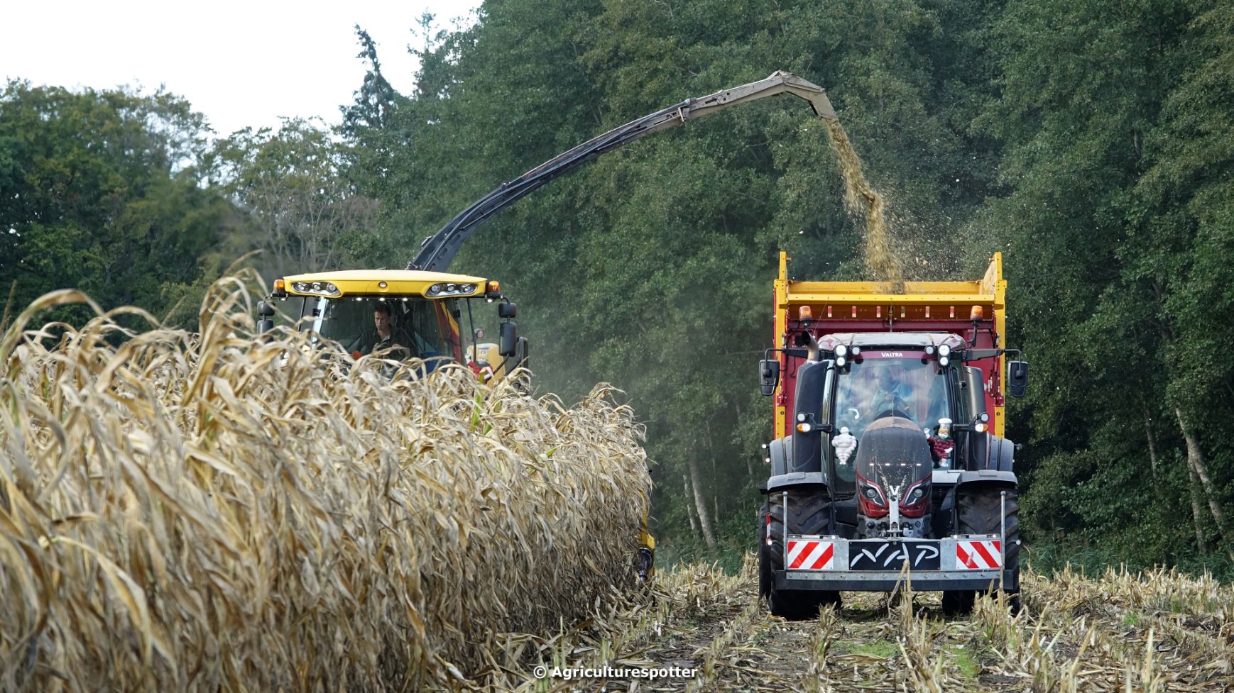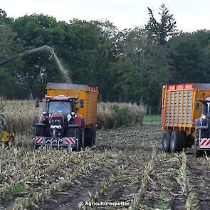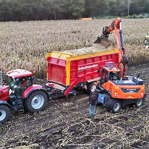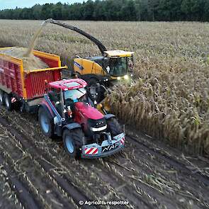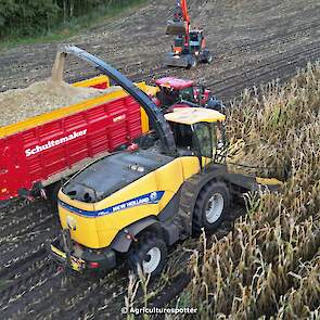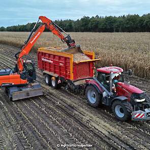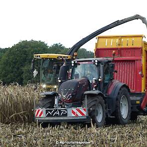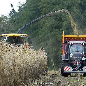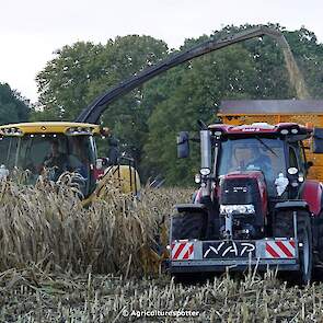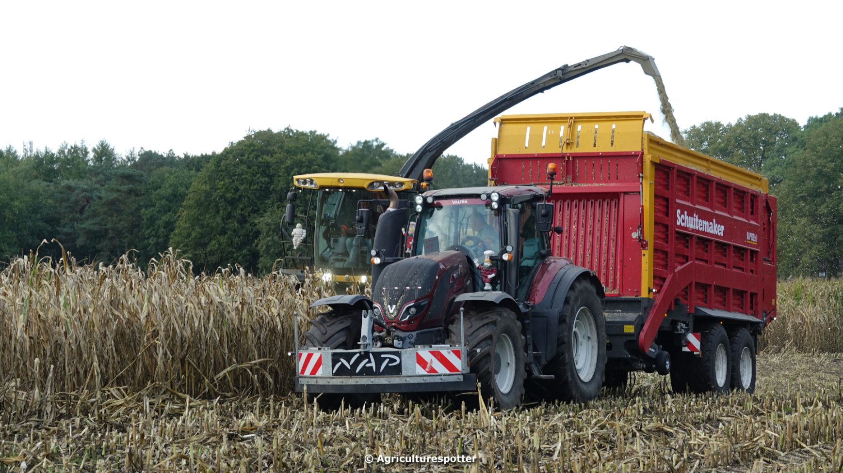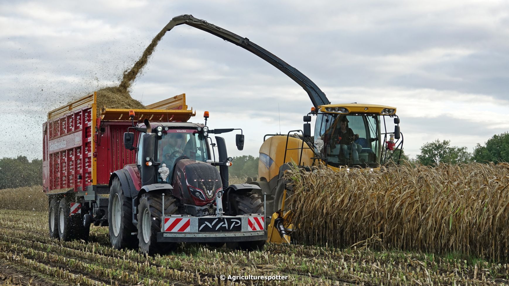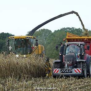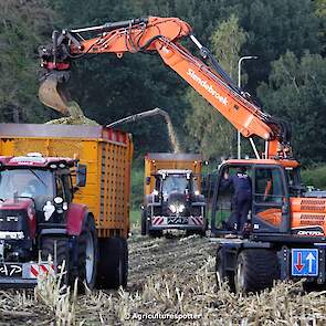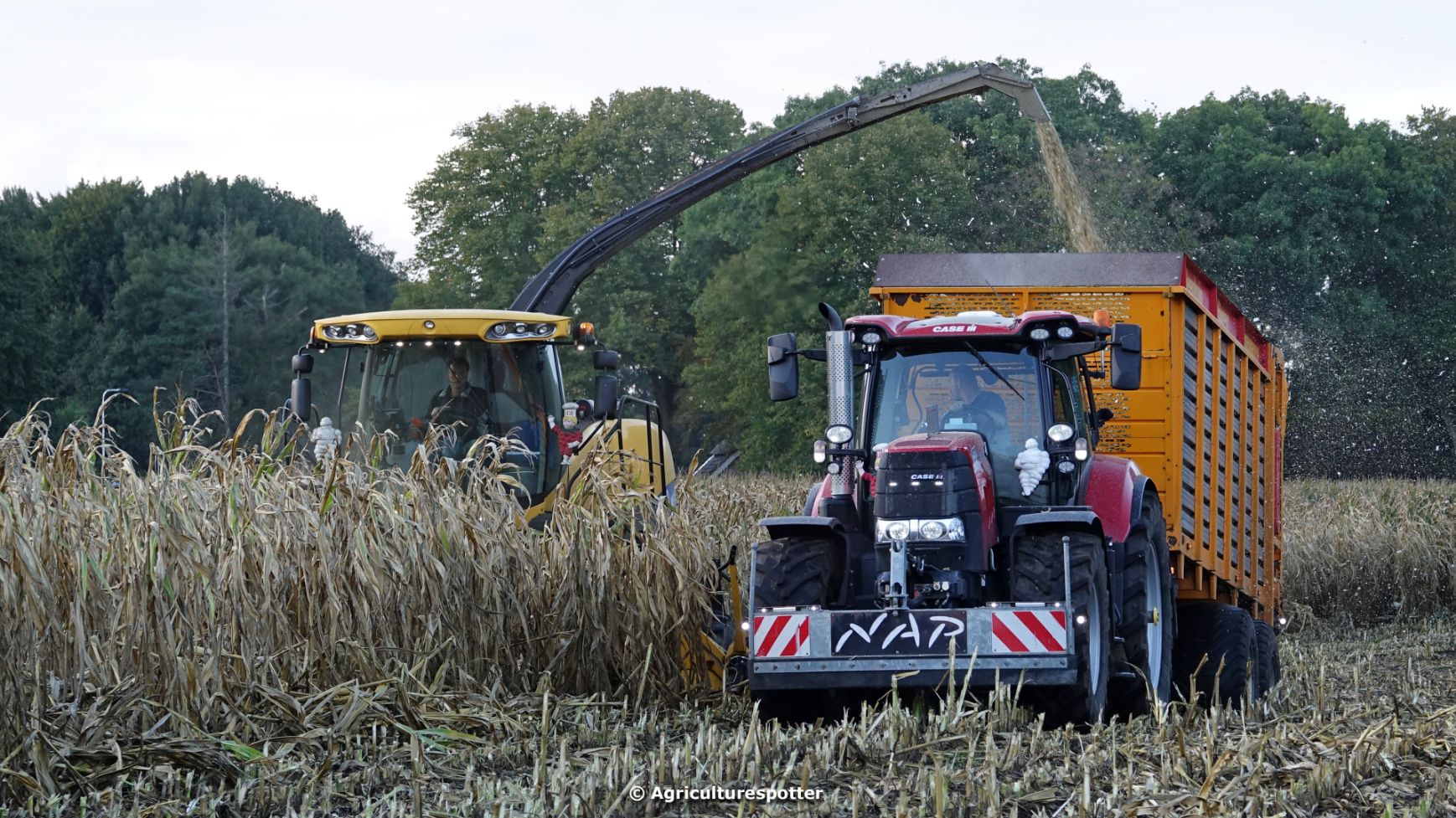 Maïs hakselen in de avonduren in Uddel (GD) met een New Holland FR600 van Loon- en Grondverzetbedrijf Nap VOF uit Ede (GD). Het transport werd gedaan met verschillende Case IH Puma's en Valtra's met Schuitemaker- en Veenhuis-silagewagens. De maïs werd extra aangedrukt in de silagewagens met een Doosan DX170W van grondverzetbedrijf H. Slendebroek uit Uddel.