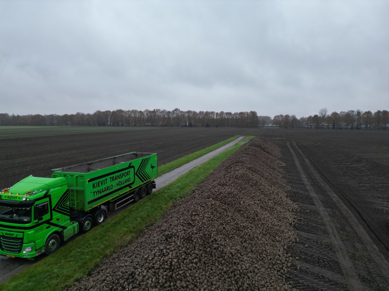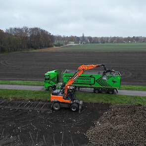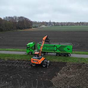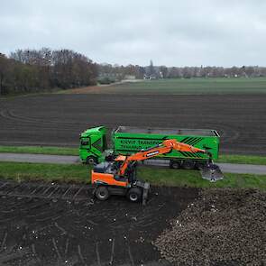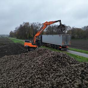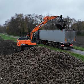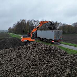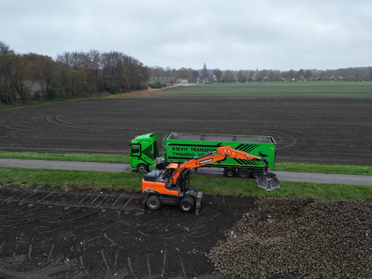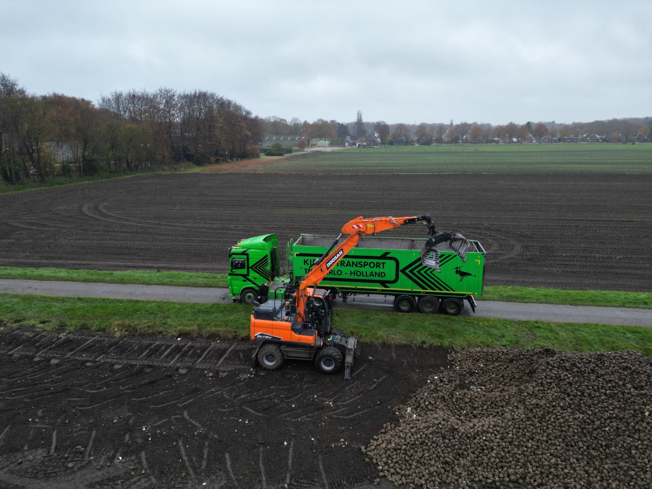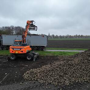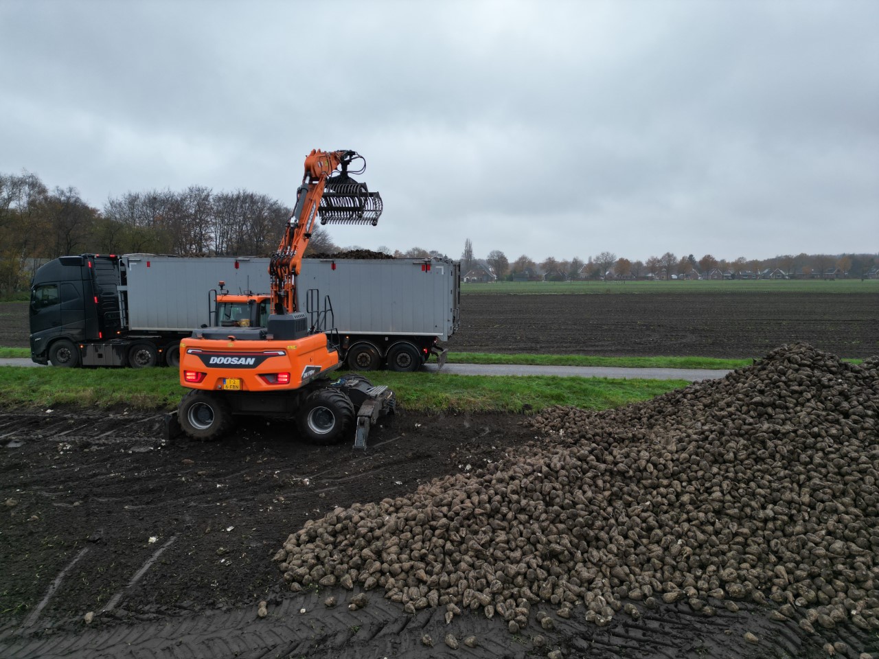 De Doosan DX170W mobiele kraan van loonbedrijf Ellen uit Klazienveen (DR) aan het suikerbieten laden op de vrachtwagens, die ze vervolgens naar de fabriek Vierverlaten van de Cosun Beet Company (voorheen Suiker Unie ) in Groningen brengt.