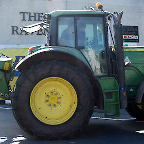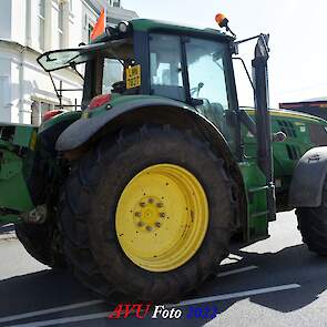 De JD 6150M met maaier JD331 moest voor de afsluiting i.v.m. de IOM-races nog snel de weg oversteken. De Massey Ferguson 6470 4-cilinder 130 pk stond uren aan het aggregaat om stroom op te wekken voor de keuken in de grote tent op het terrein.
