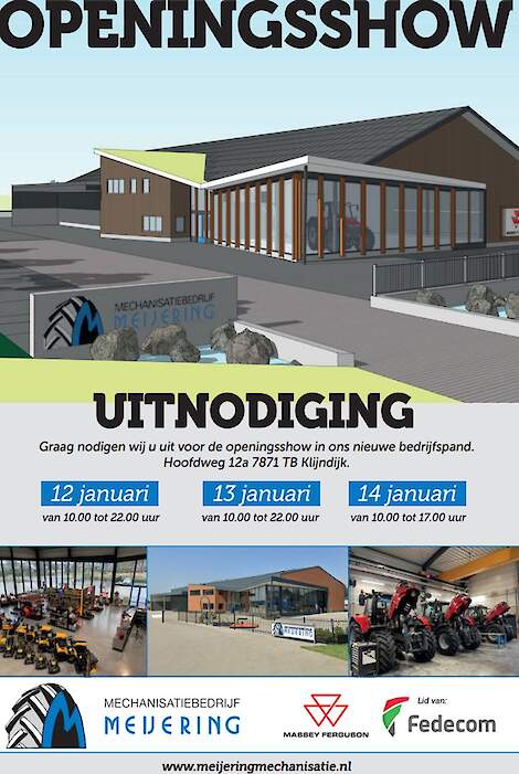 Mechanisatiebedrijf Meijering opent de deuren voor iedereen die het nieuwe bedrijfspand wil komen bekijken tijdens de openingsshow. Men is van harte welkom.