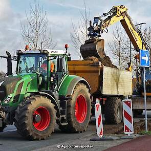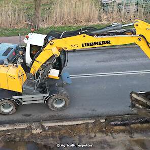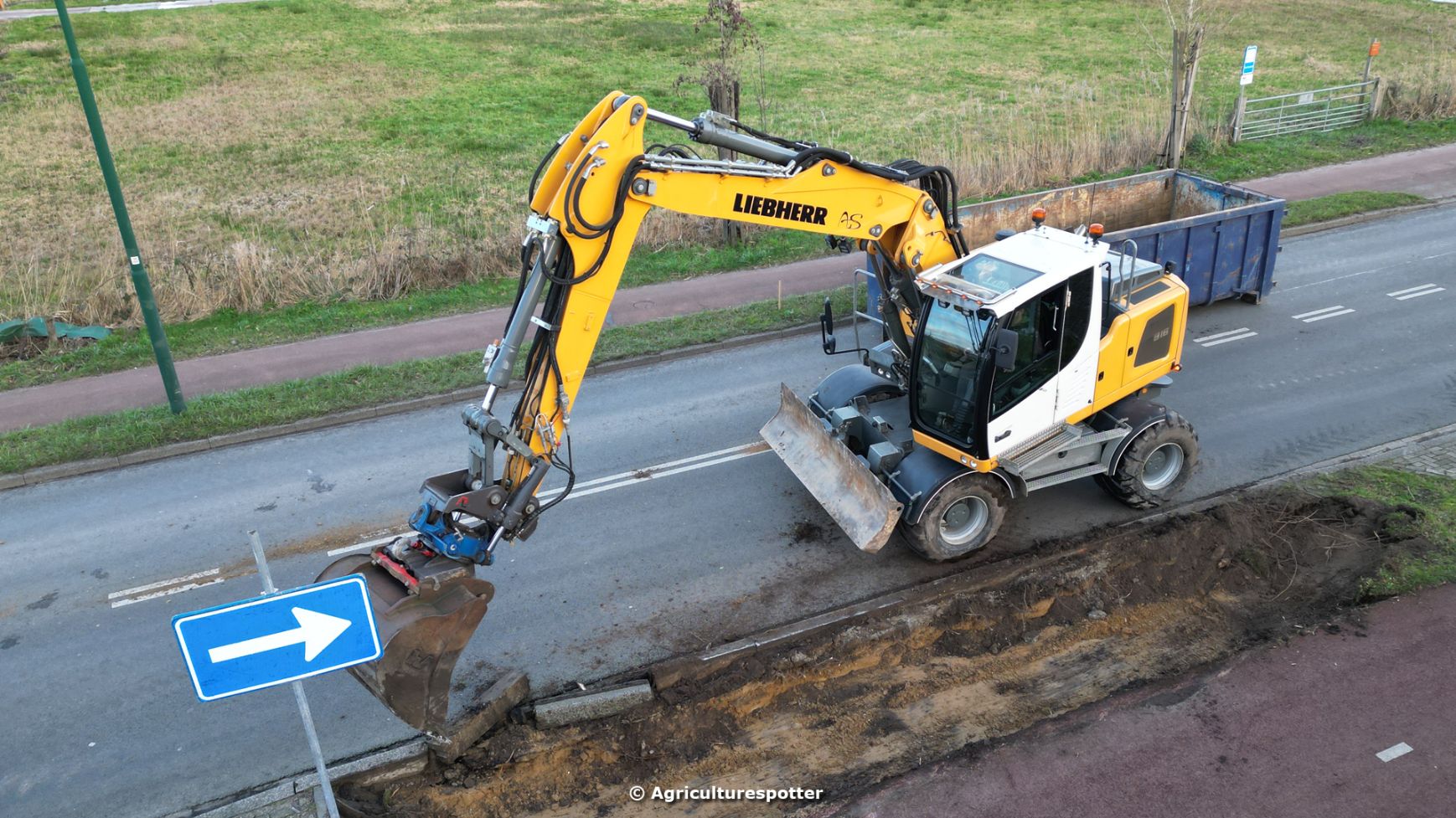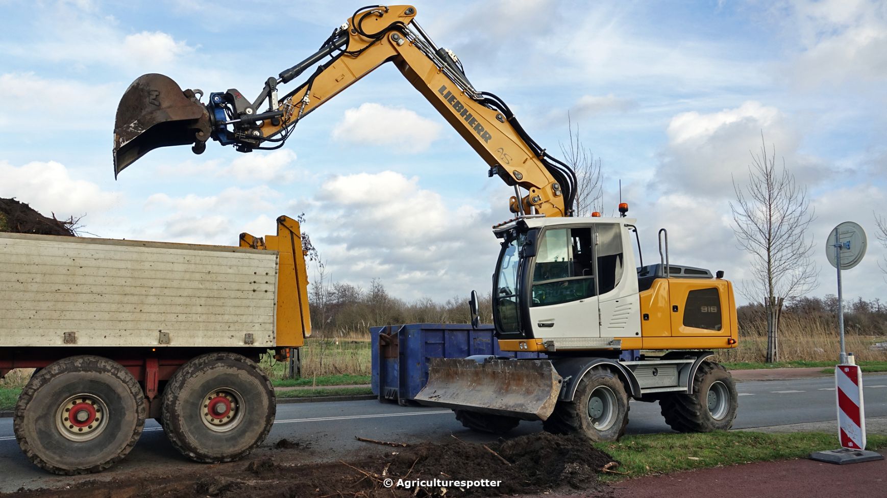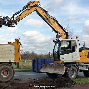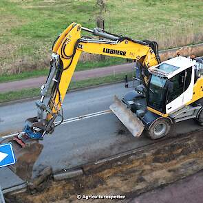 Grondwerk voor de vernieuwing van het riool in de Wageningselaan in Veenendaal (UT) met een Liebherr A 916 Litronic en een Fendt 828 Vario van loonbedrijf Schimmel Overberg BV.