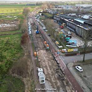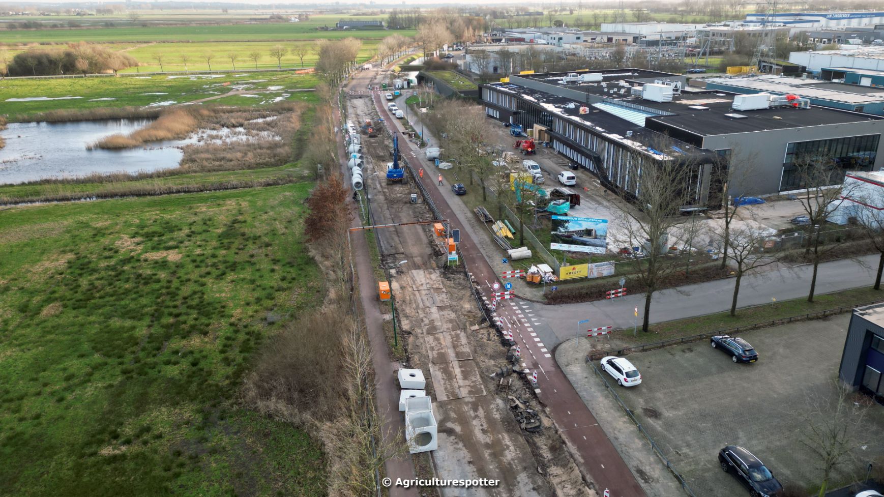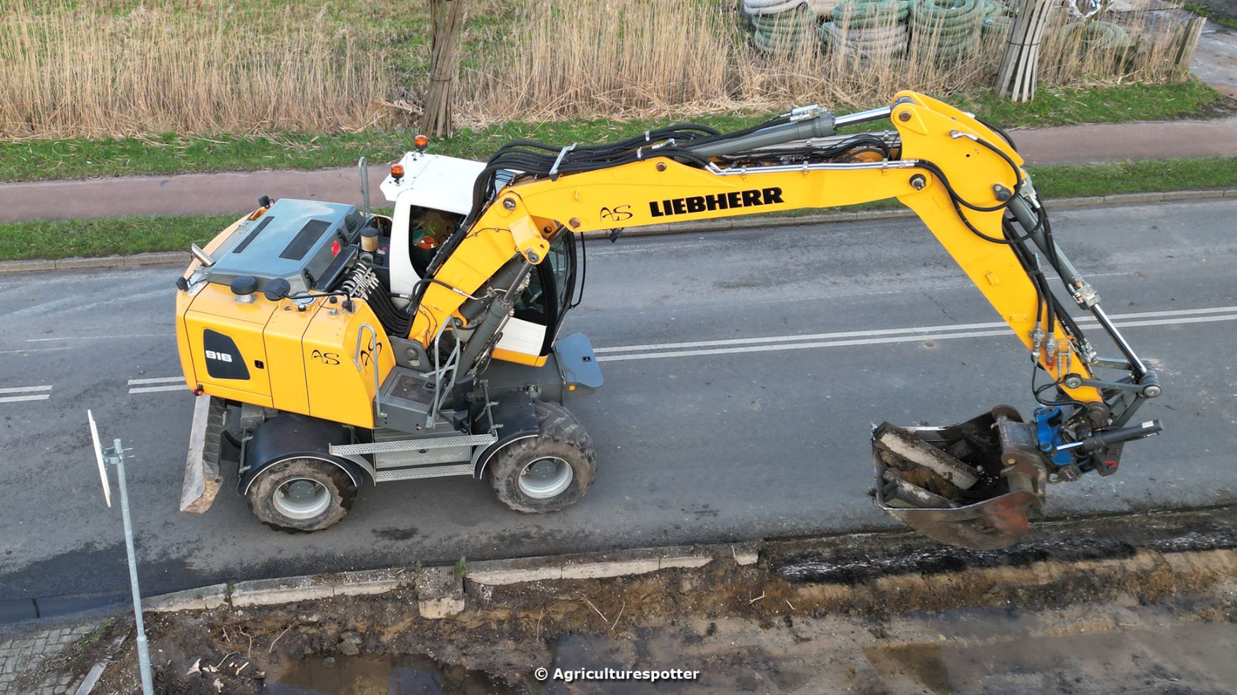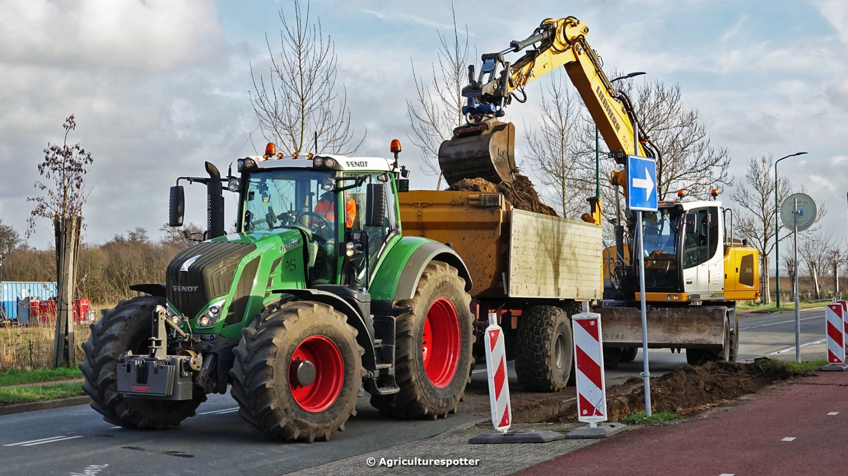 Grondwerk voor de vernieuwing van het riool in de Wageningselaan in Veenendaal (UT) met een Liebherr A 916 Litronic en een Fendt 828 Vario van loonbedrijf Schimmel Overberg BV.