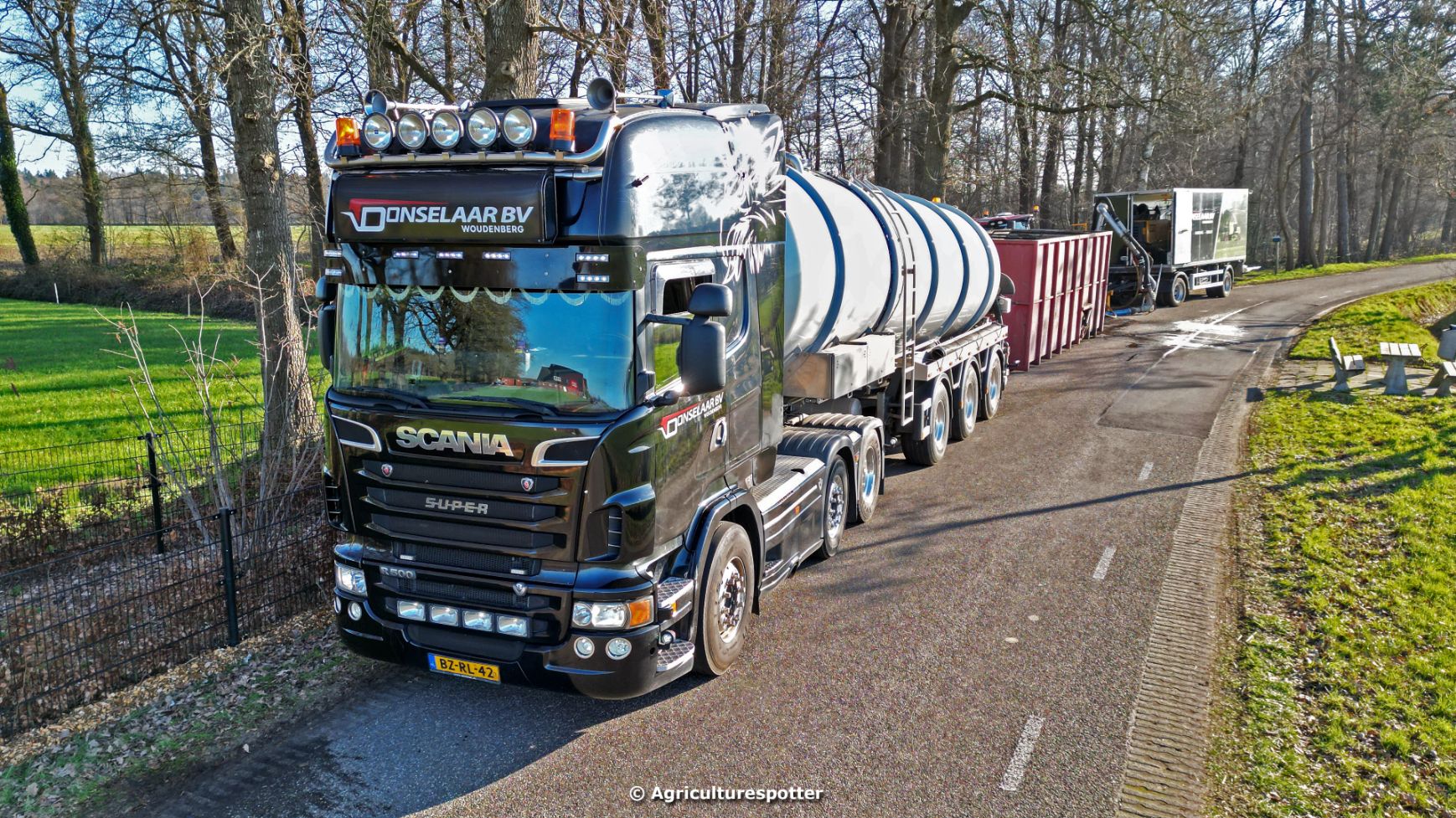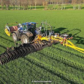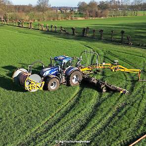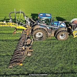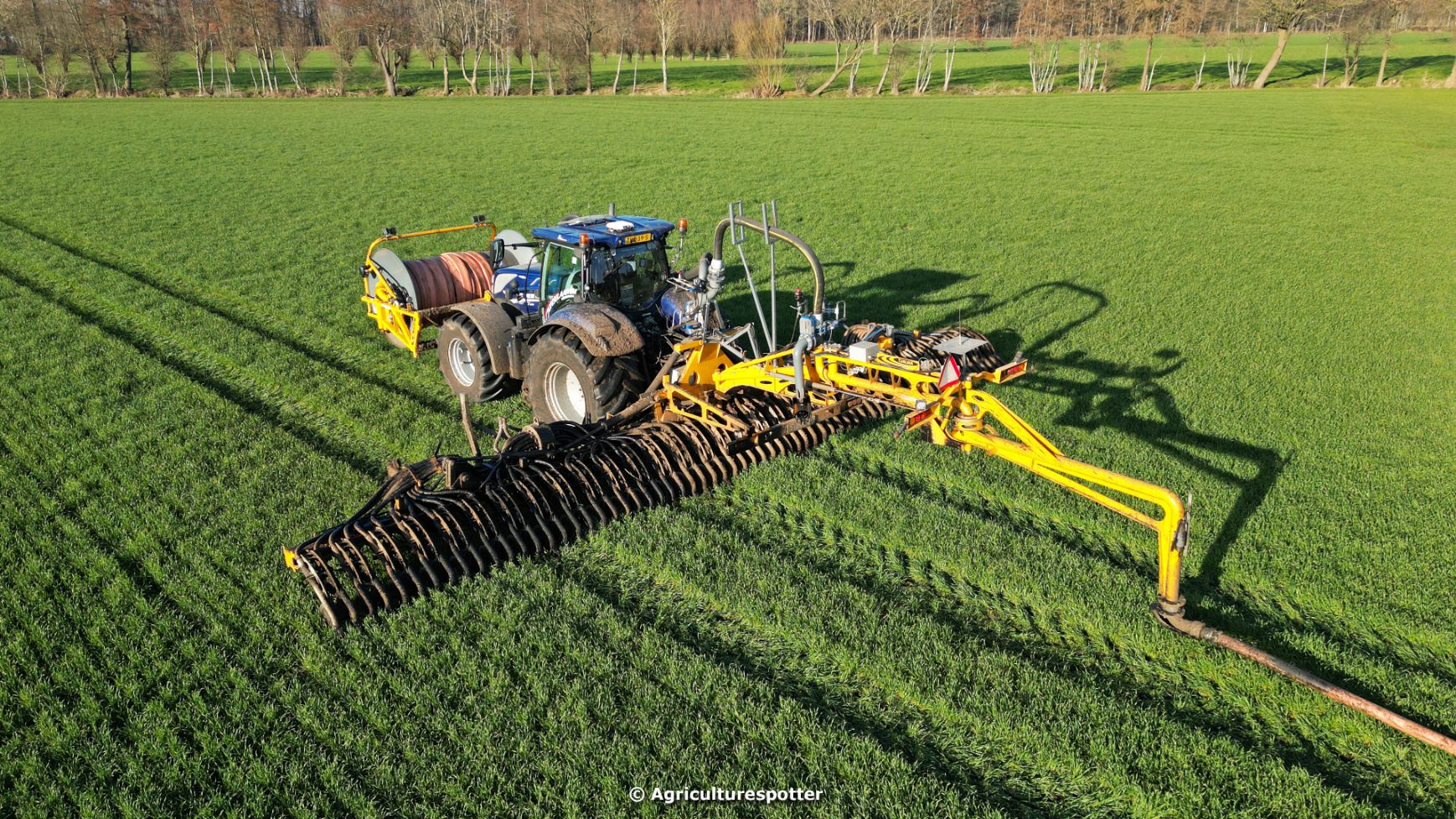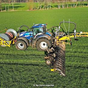 Sleepslangbemesten in Scherpenzeel (GD) met een New Holland T7.230 Blue Power en een Tjalma-sleepslanginstallatie van Loon- en Verhuurbedrijf Donselaar uit Woudenberg (UT). De Tjalma-pomp werd aangedreven door een nieuwe Case IH Puma 220 AFS. De mest werd aangevoerd met een Scania R 500.