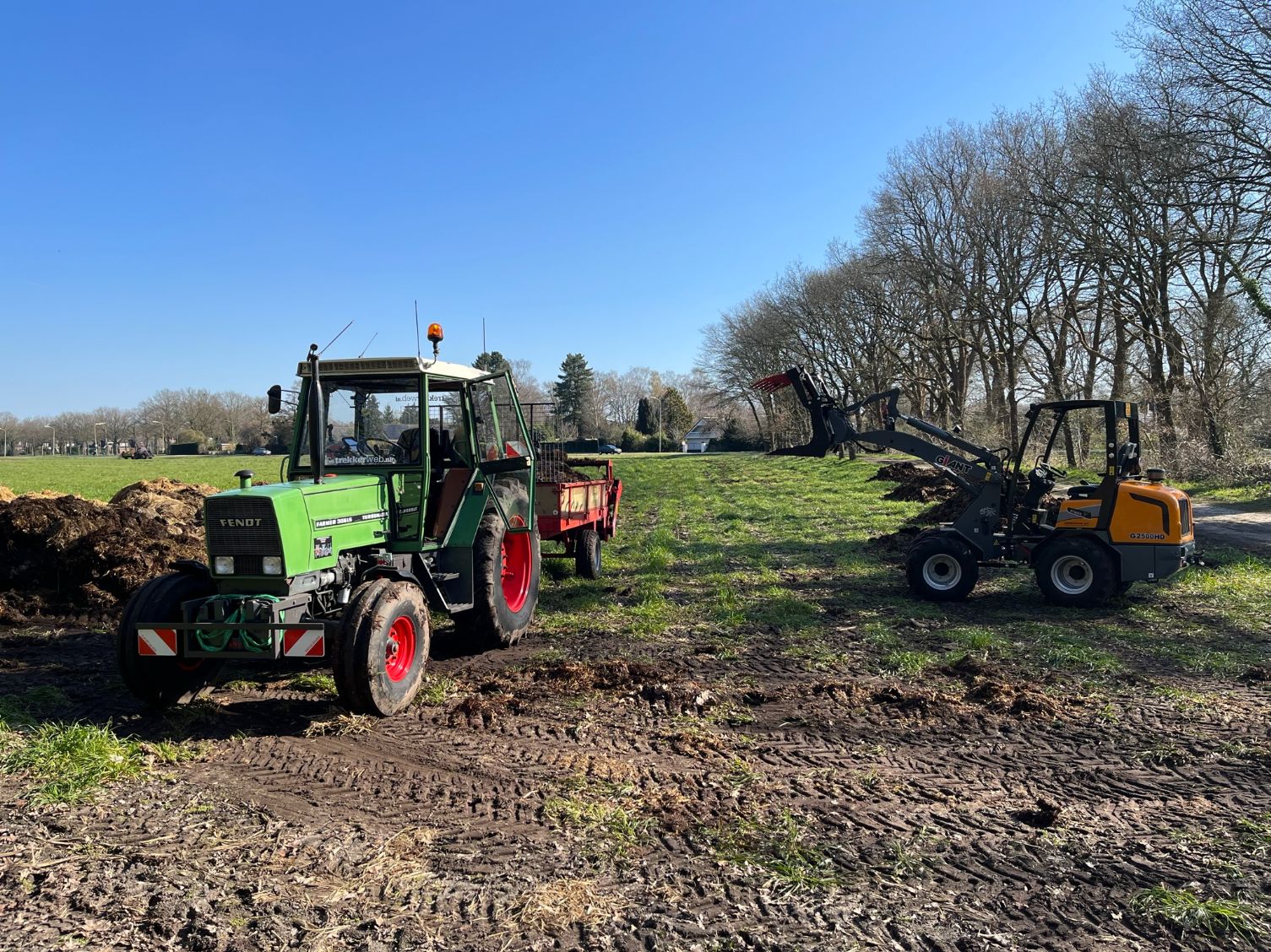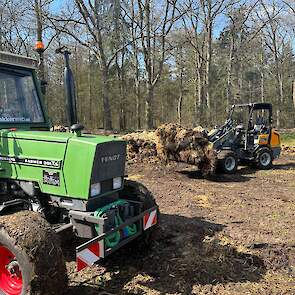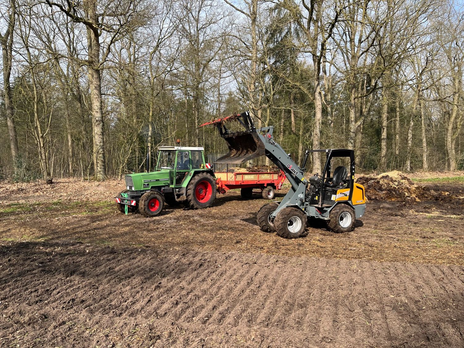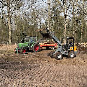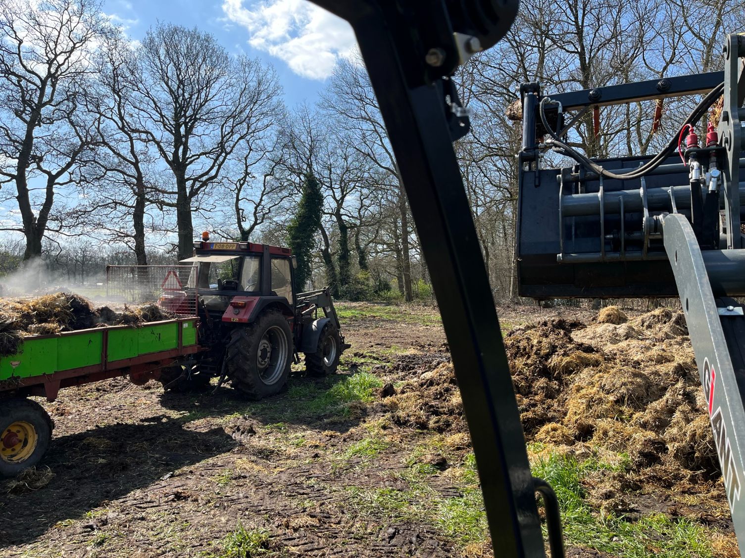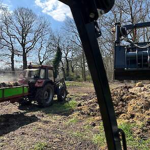 Stalmest verspreiden bij stadsboerderij ’t Nije Hoff. Met de Tobroco Giant werd de mest opgeladen op de twee verspreiders: een Krone Optimat en een Strautmann-meststrooier.