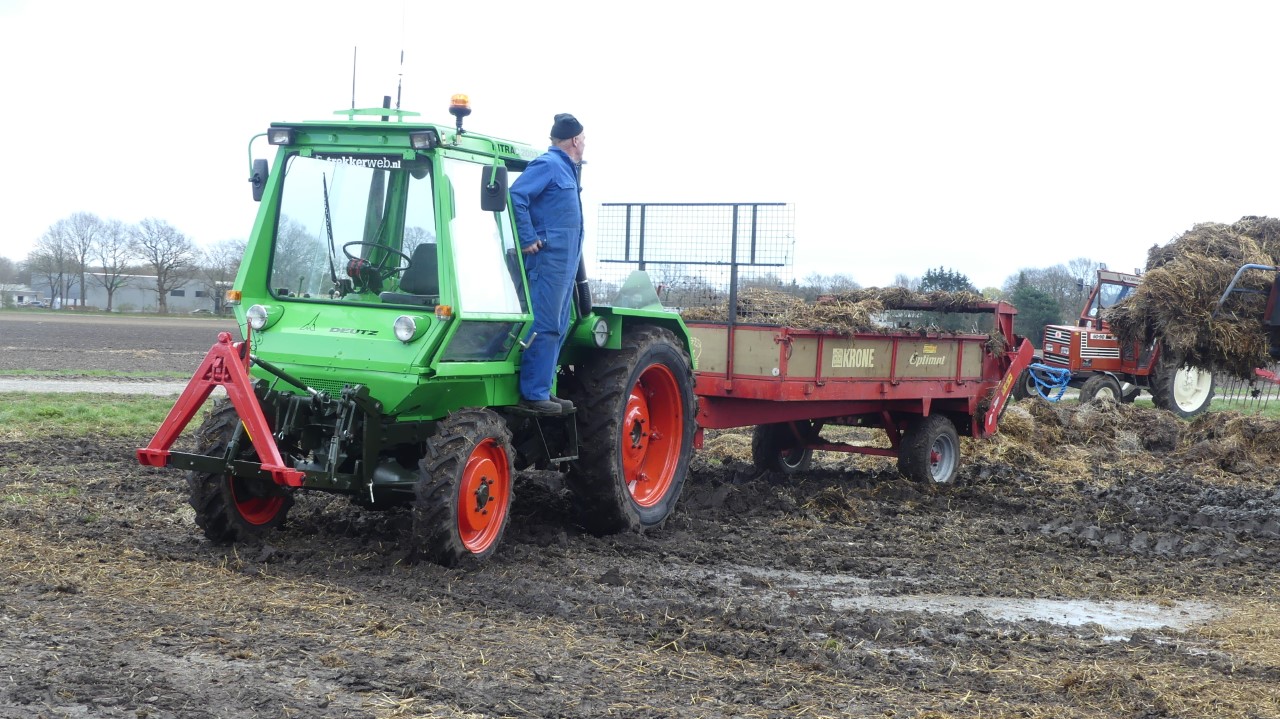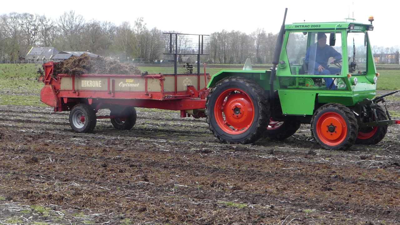 Doornbos Agrarisch Loonwerk uit Zuidbarge volop in de vaste mest. De Fiat 60-90 met Wifo-achterlader en de Case-IH 845 XL met voorlader zorgen voor het vullen van de wagen, waarna de Deutz Intrac 2003A met de Krone Optimat-mestverspreider de mest over het land brengt.