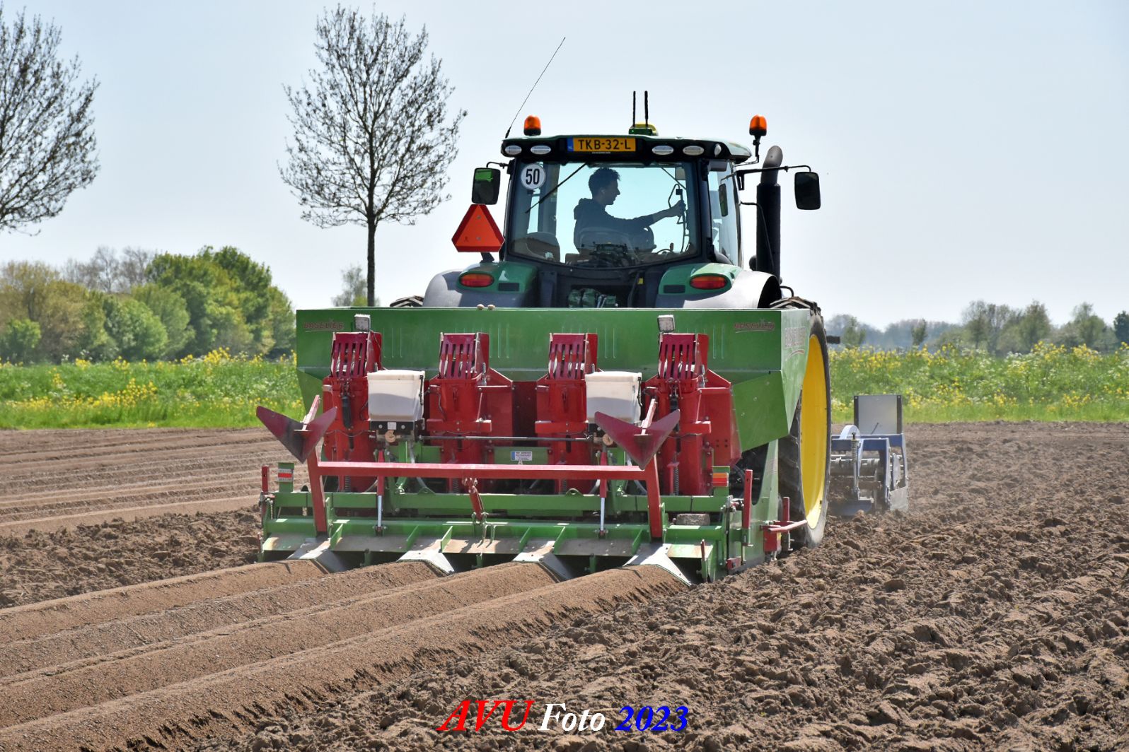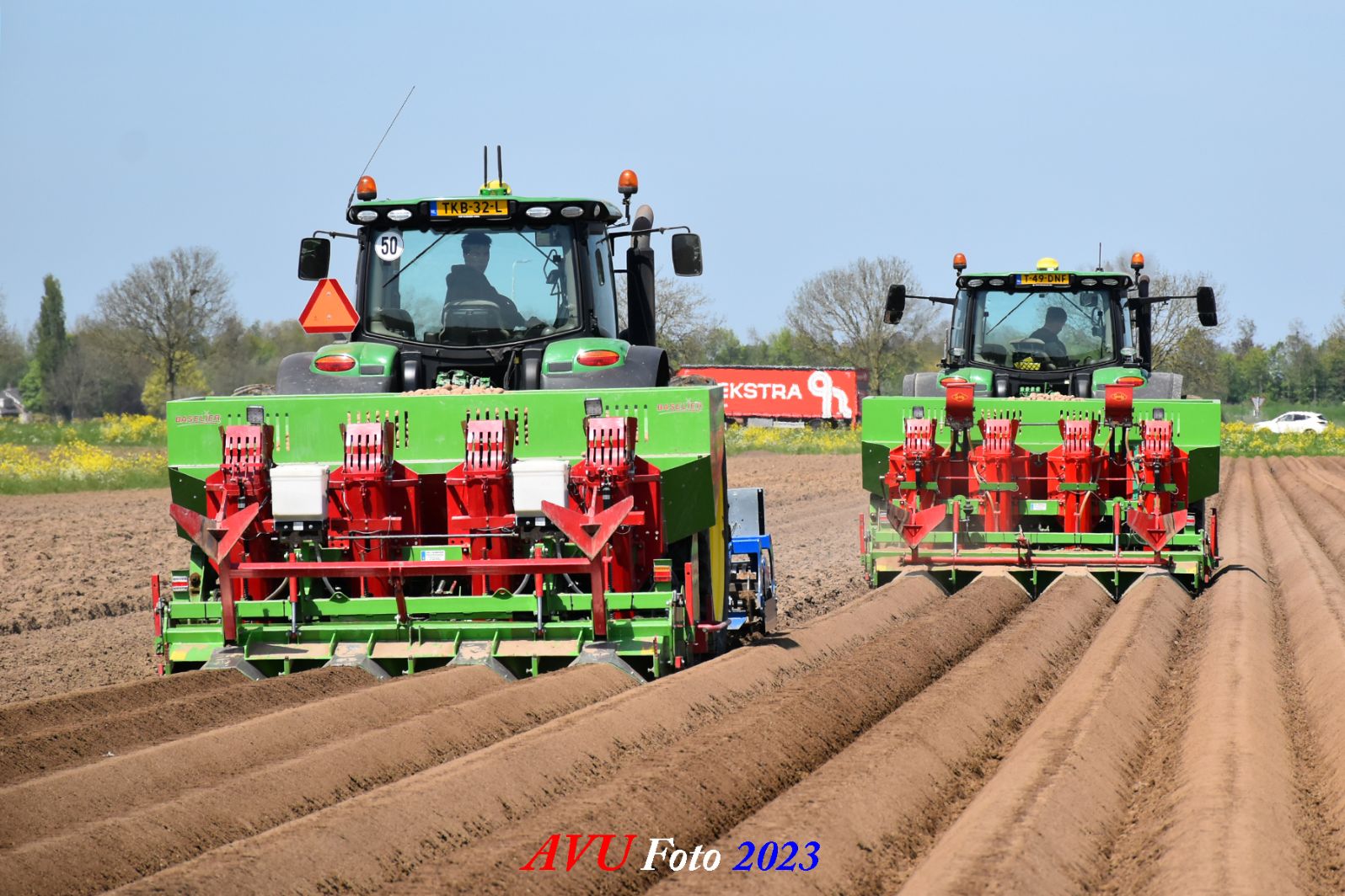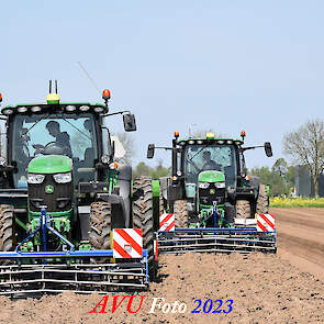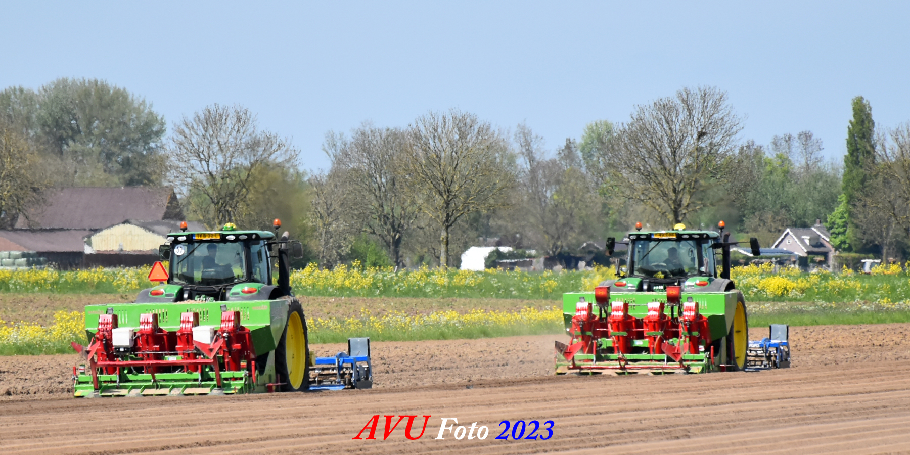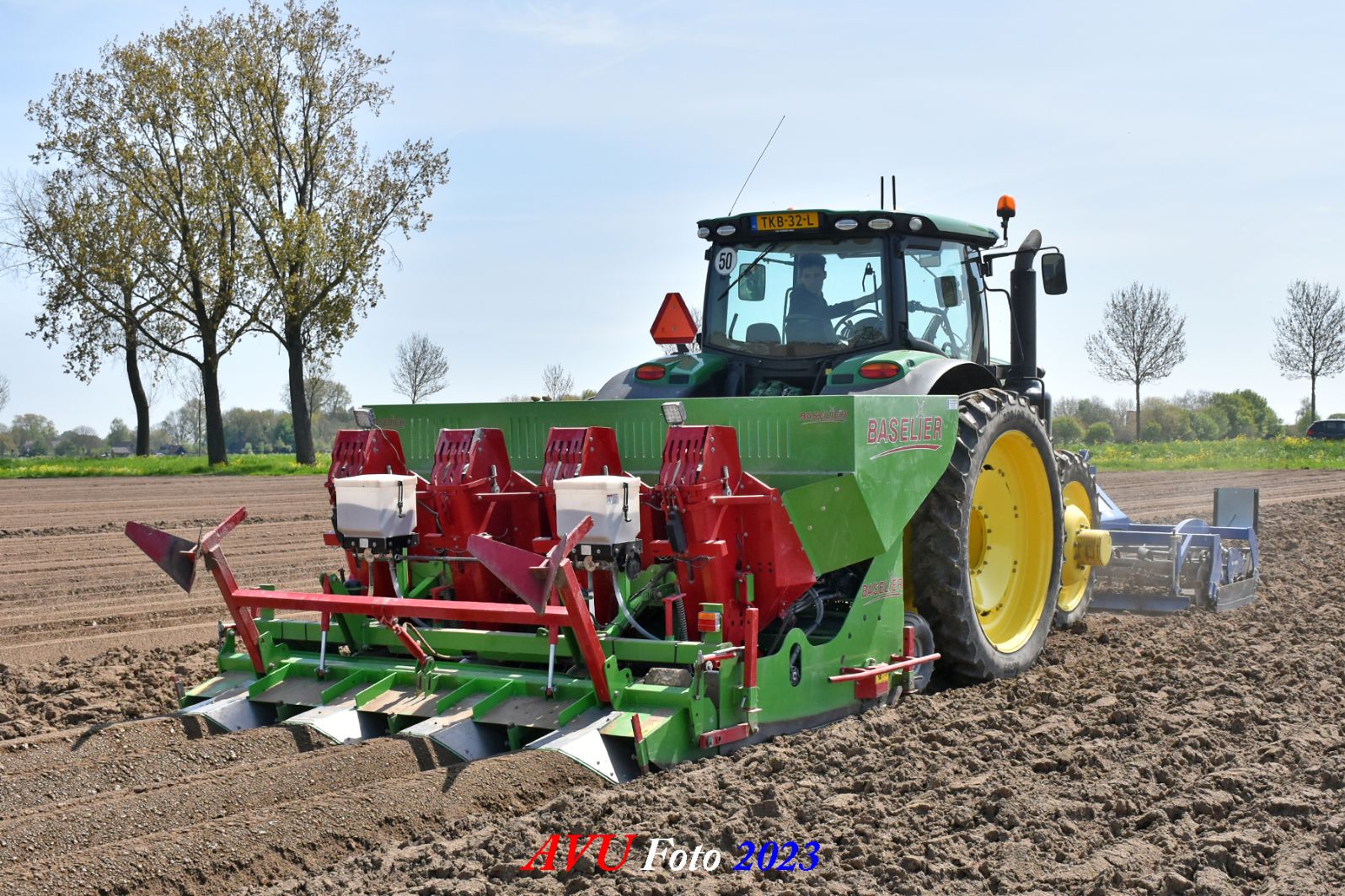 Dit was een van de eersten die aan het poten was in het Land van Heusden en Altena en nog wel met twee John Deere's 6215 R met VSS Agro-frontbereider en Baselier-Wifo frees-pootcombinaties op een groot perceel waar een speciaal plantsysteem, Precisieteelt Plus-systeem, werd toegepast.