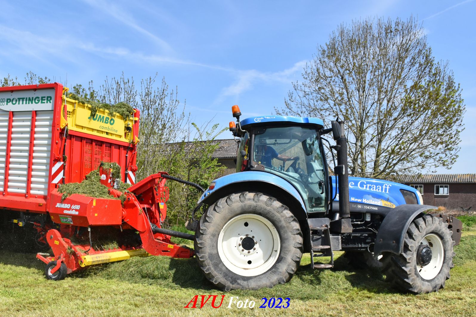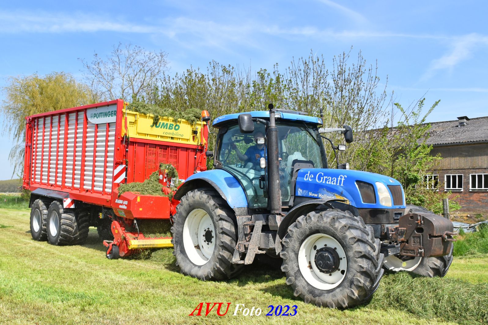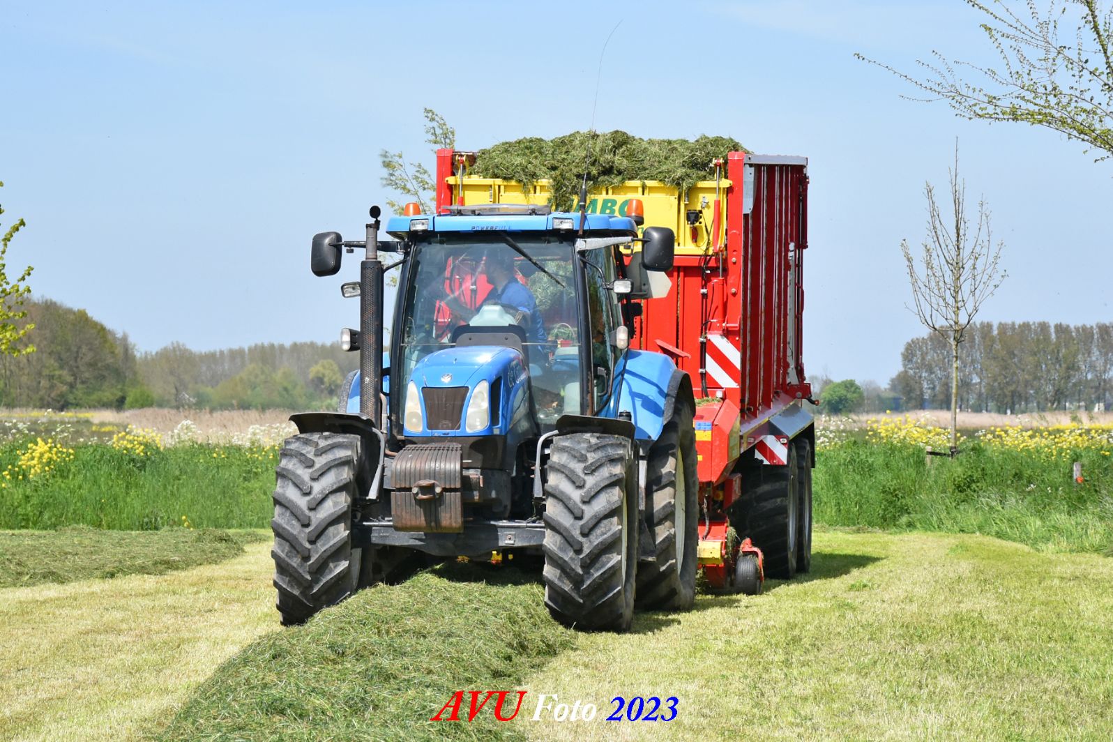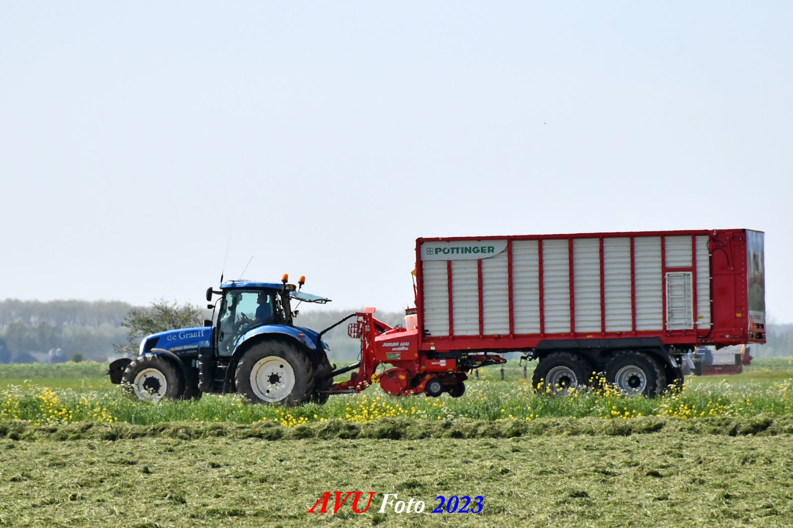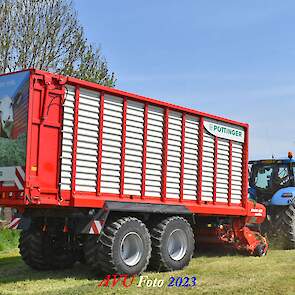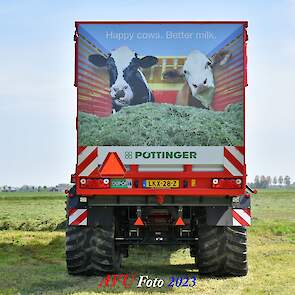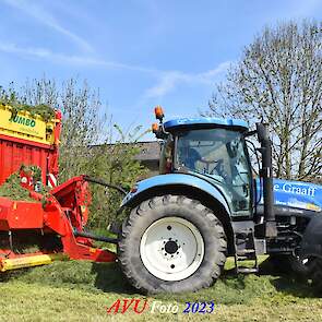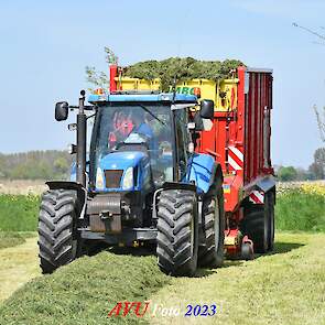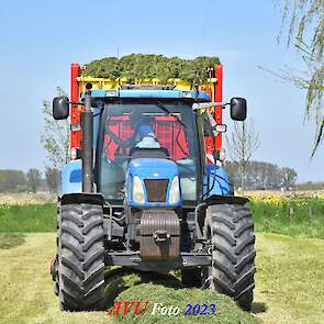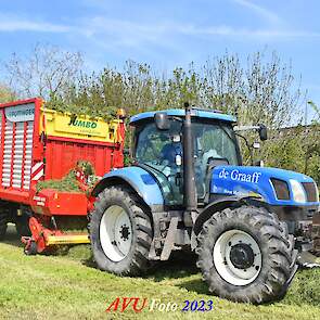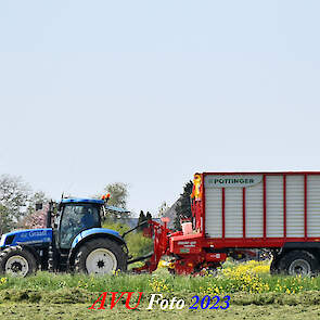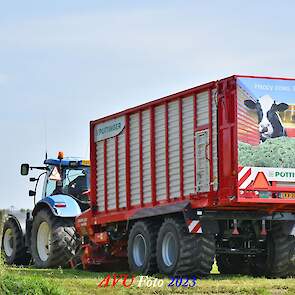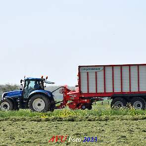 Vandaar dat deze direct, nadat de eerste buitenronde op een rug gelegd was, meteen werd opgeraapt door de New-Holland T-6080 en Pottinger Jumbo 6610 L Combiline-opraapwagen en naar de bult werd gebracht.