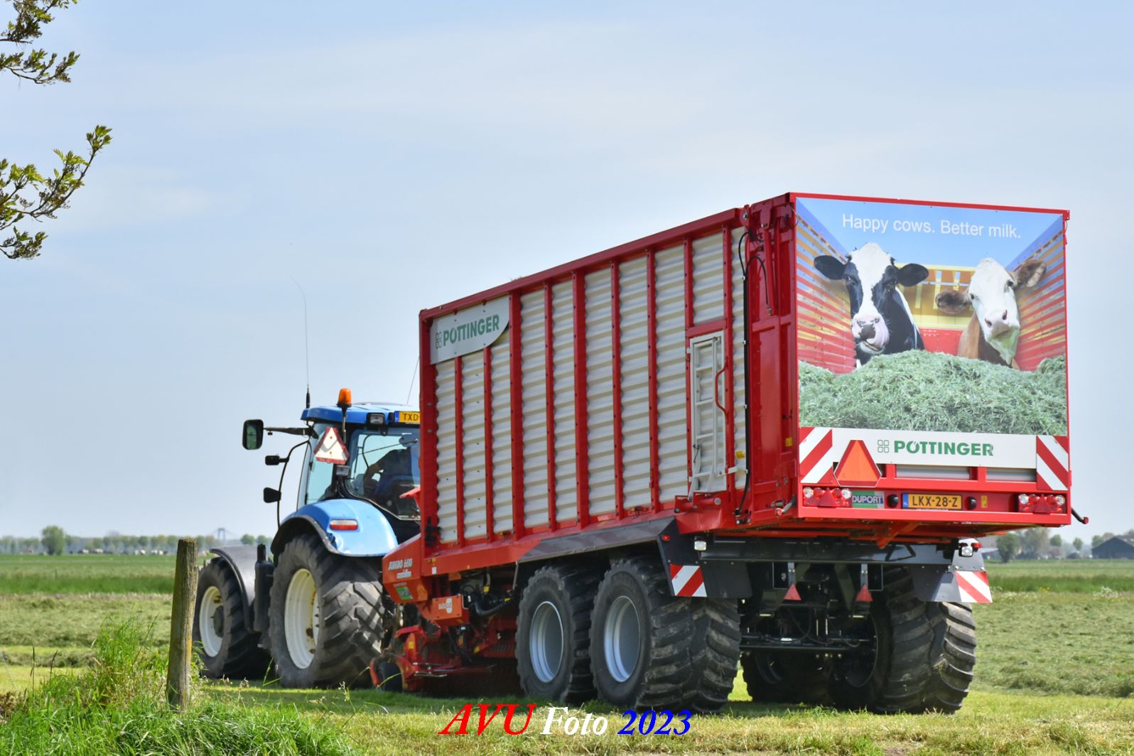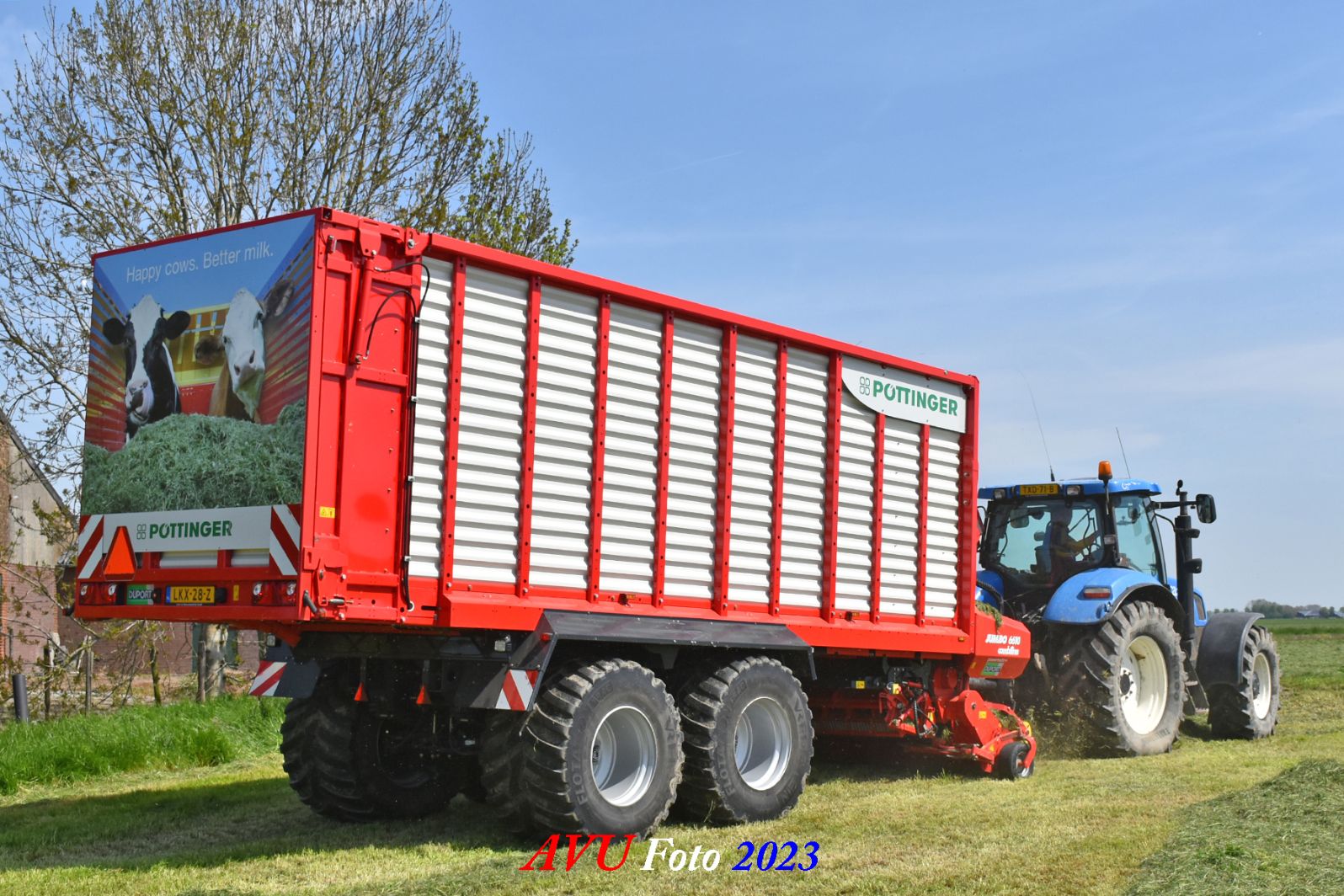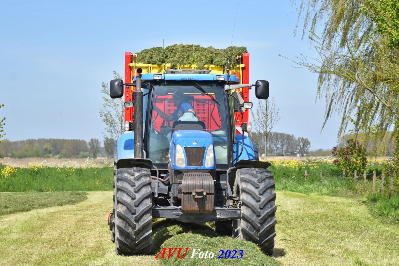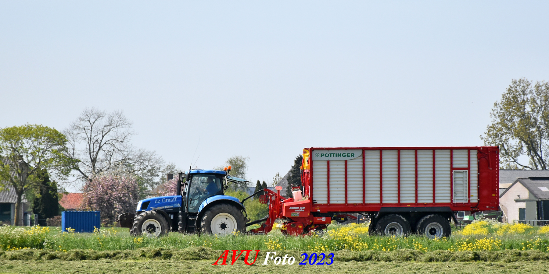 Vandaar dat deze direct, nadat de eerste buitenronde op een rug gelegd was, meteen werd opgeraapt door de New-Holland T-6080 en Pottinger Jumbo 6610 L Combiline-opraapwagen en naar de bult werd gebracht.