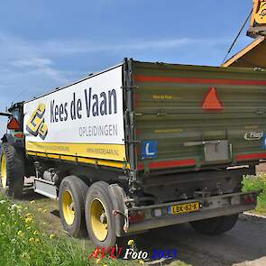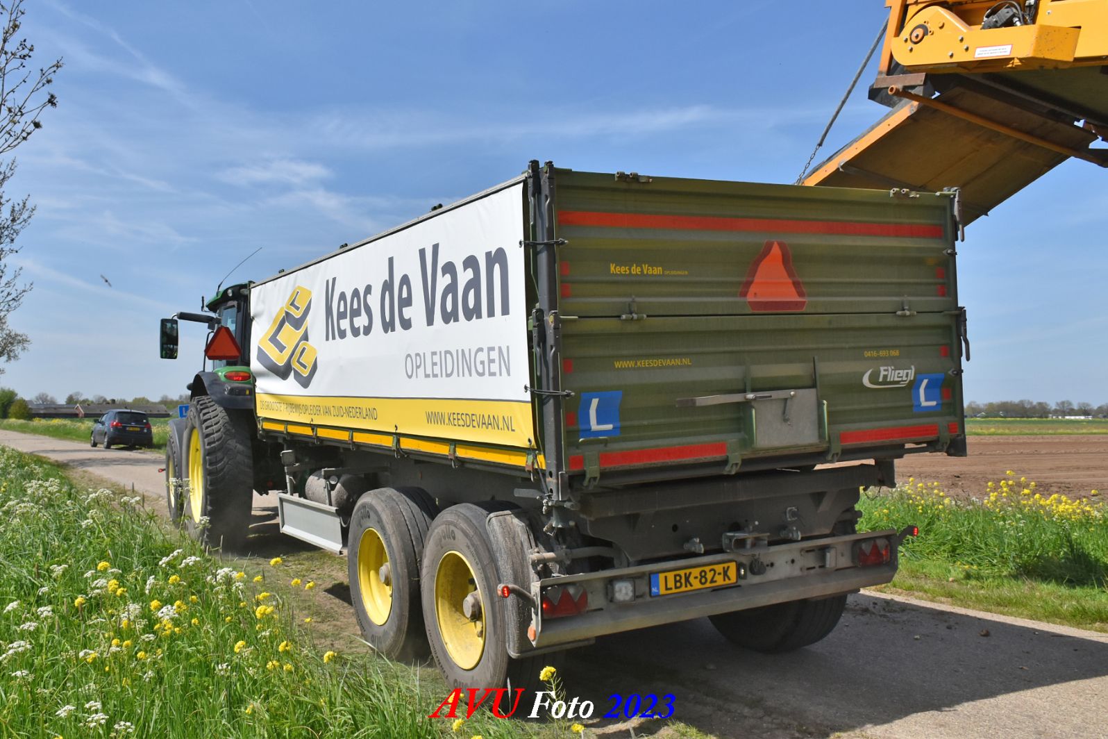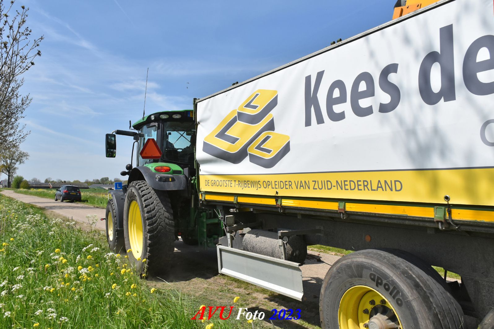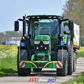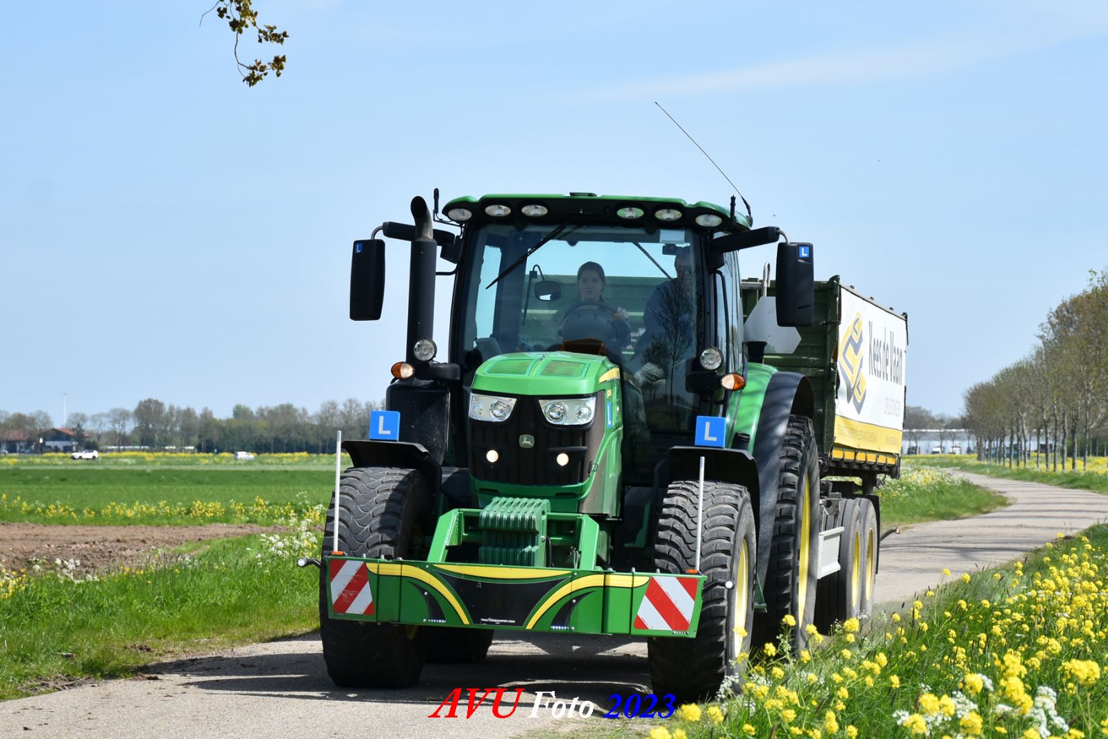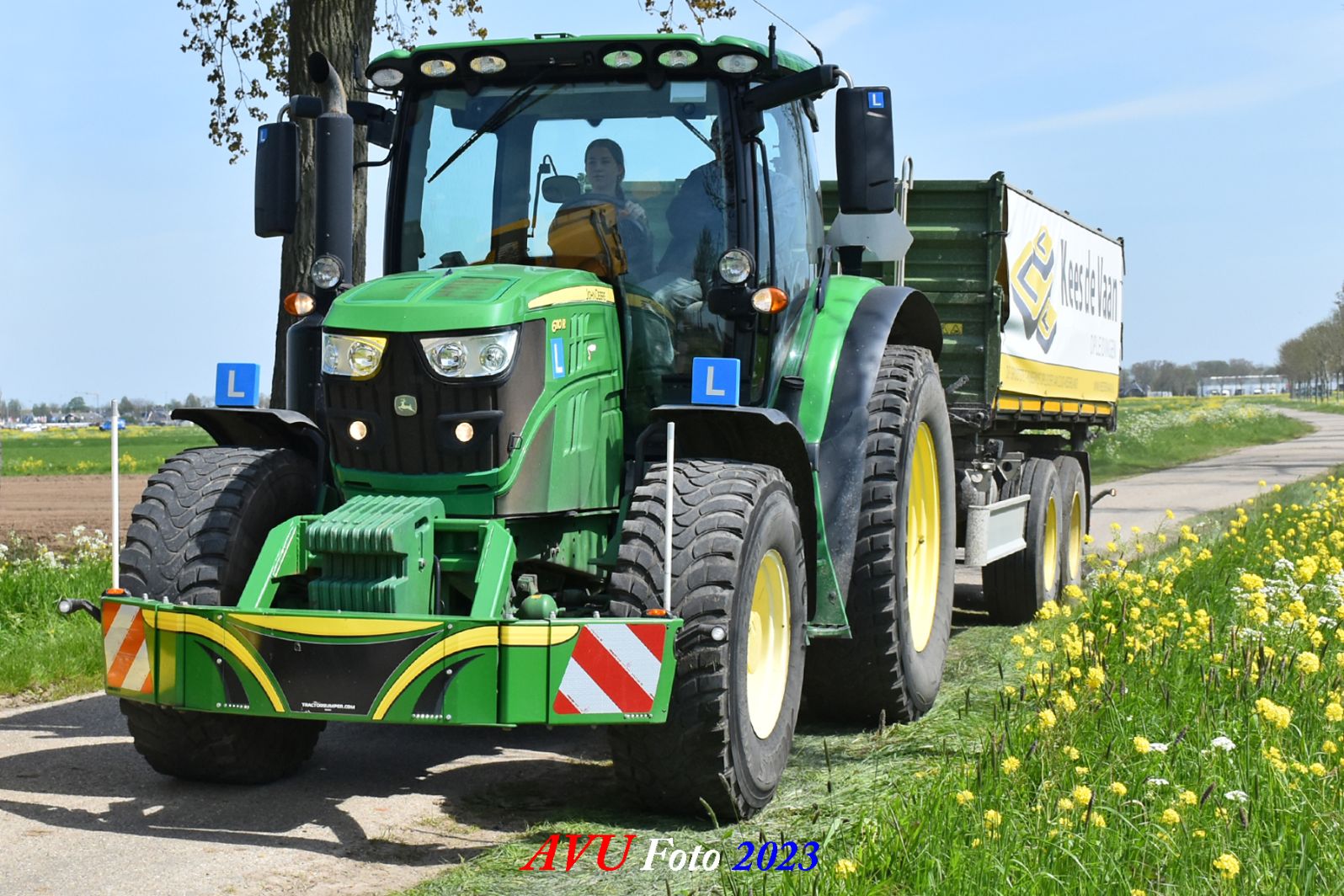 Deze dame moest uitwijken met de John Deere 610R en Fliegl-aanhanger om de VGM-combinatie te passeren tijdens het lessen voor haar CBR-trekkerrijbewijs. Suc6, we hopen dat ze geslaagd is.