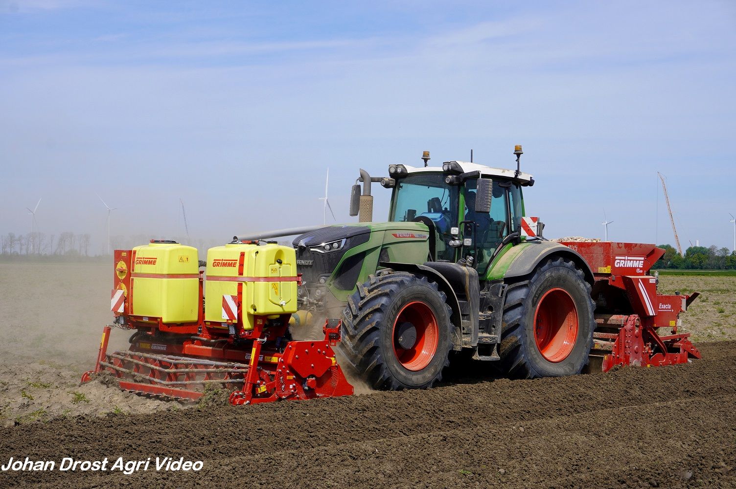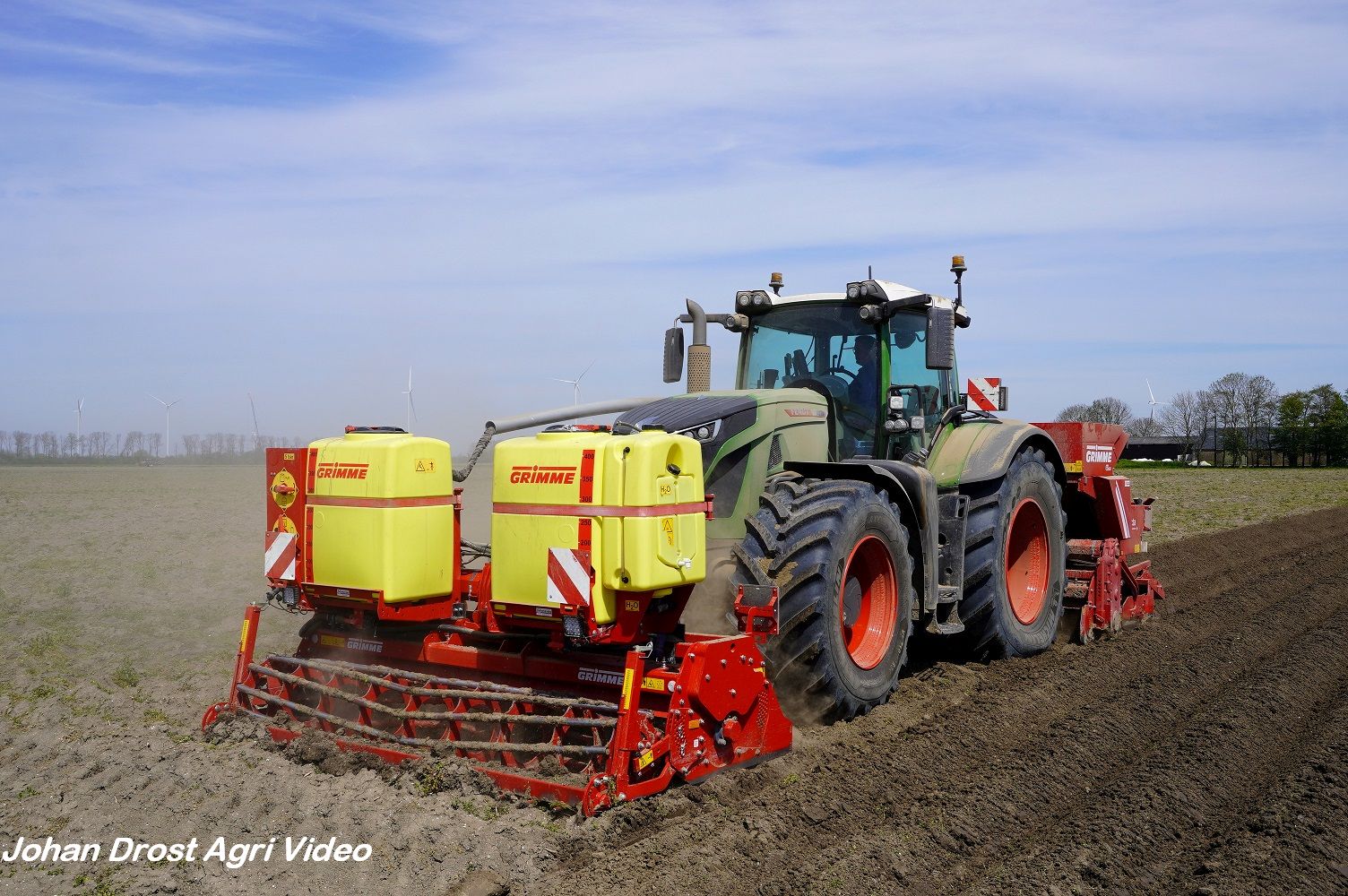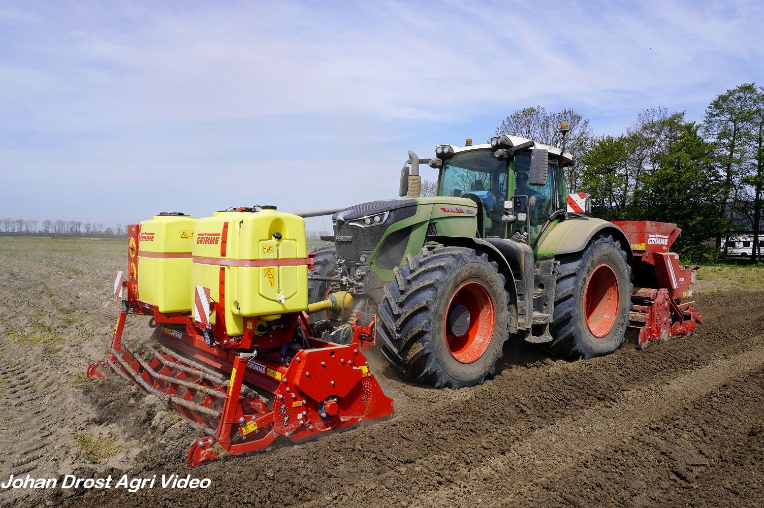 Akkerbouwbedrijf van der Weijden uit Biddinghuizen (FL) aan het aardappelen poten met een nieuwe Fendt 942 Vario, een Grimme-frontbereider en een Grimme GR300/ Exacta GL 420-pootmachine.