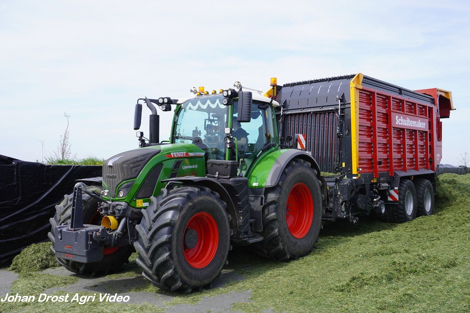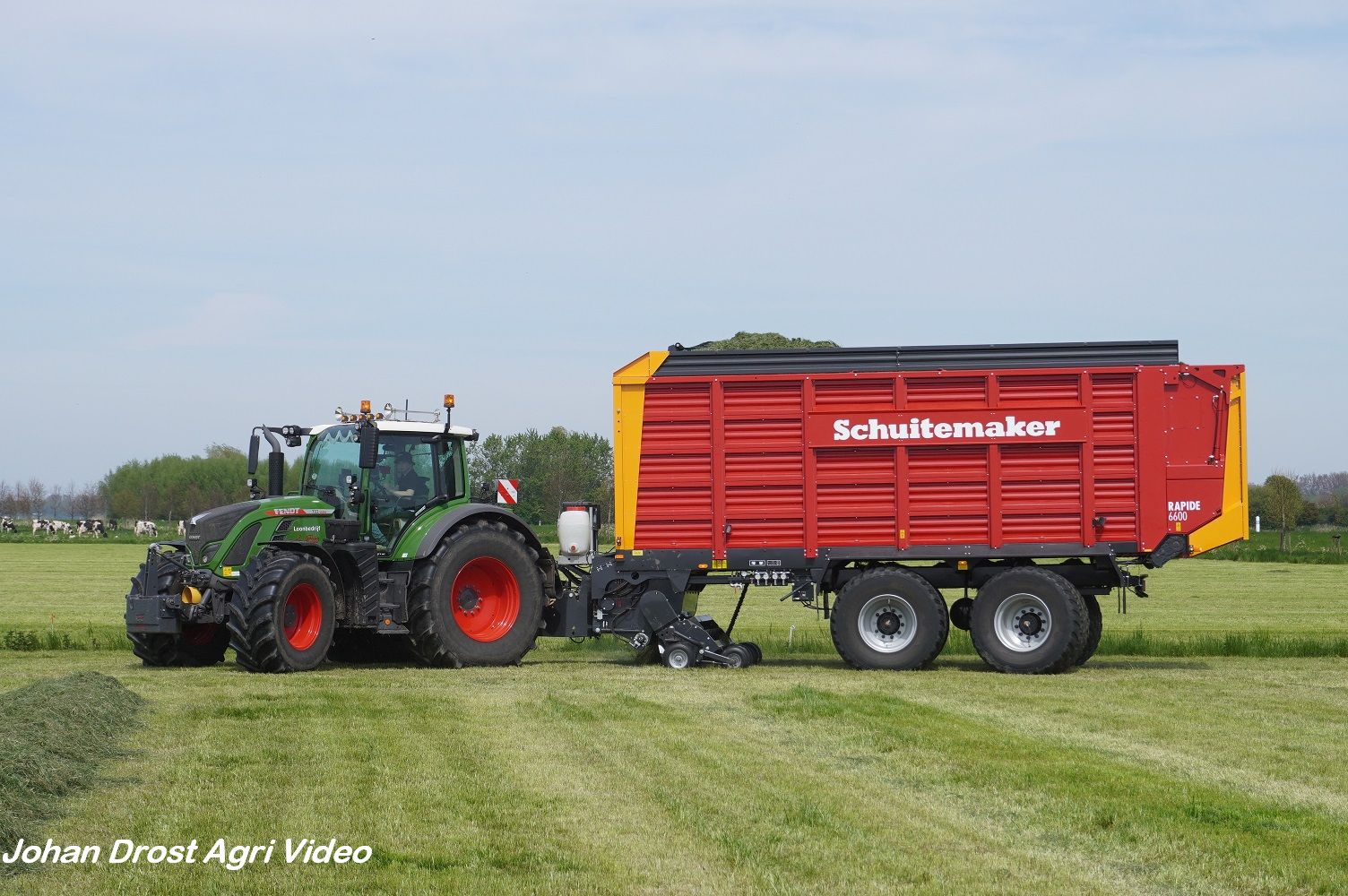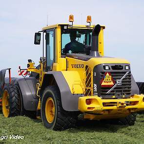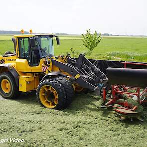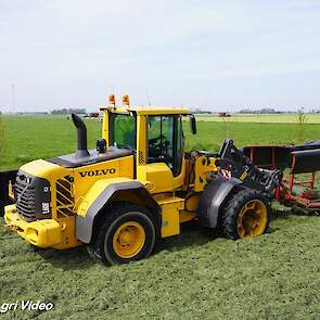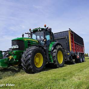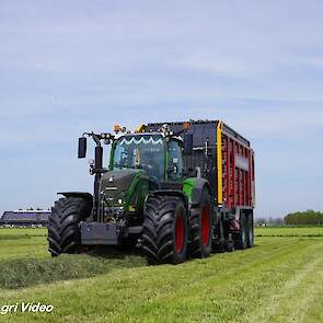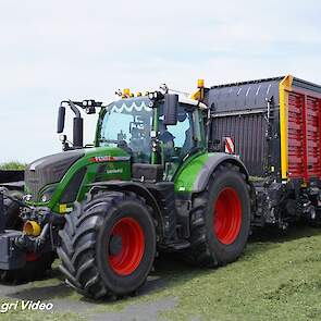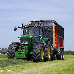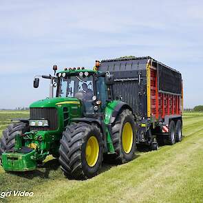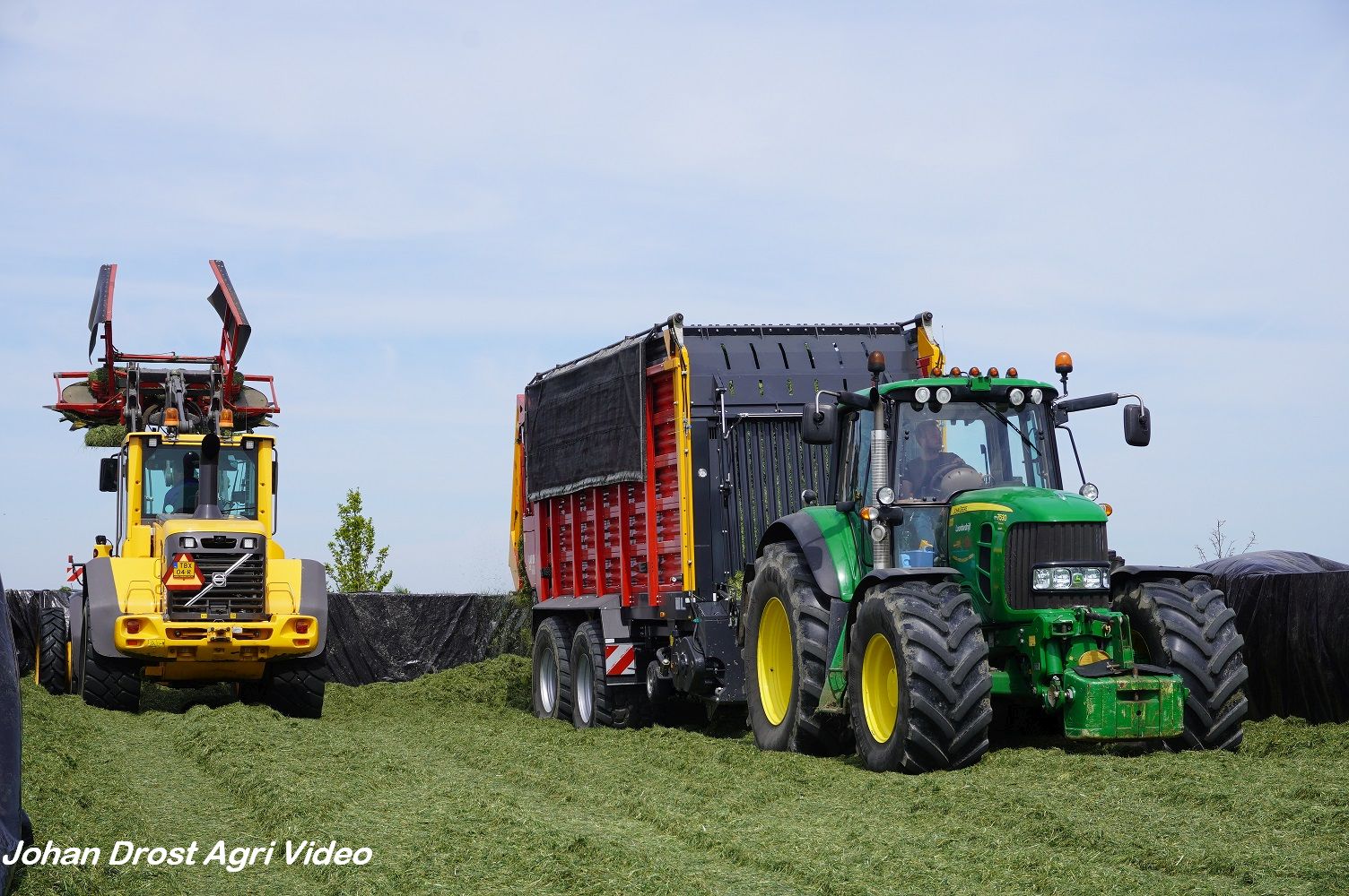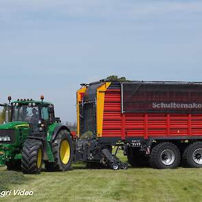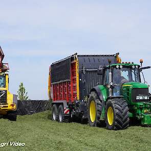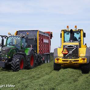 Loonbedrijf van de Put uit Oosterwolde (GD) aan het gras inkuilen met een John Deere 7530 en een Fendt 722 Vario met Schuitemaker Rapide 6600. Op de kuil een Volvo L60F.