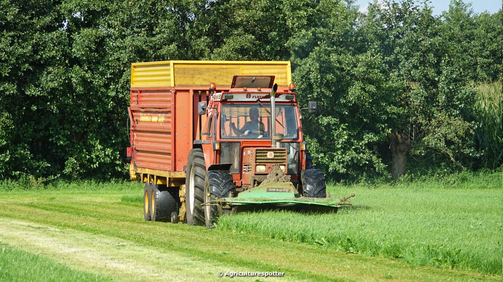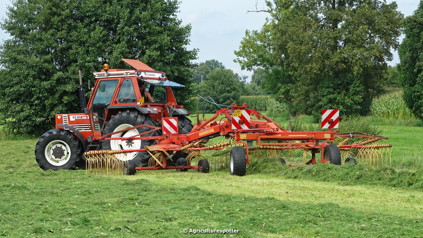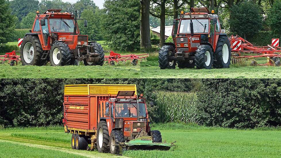 Gras schudden met een Fiat 110-90 en een Lely Lotus 900-schudder. Gras harken met een Fiat 85-90 Turbo DT en een Niemeyer Twin 850-VS-hark. Zomerstalvoeren met een Fiat 85-90 en Deutz-Fahr KM 3.27 FS-frontmaaier en een Schuitemaker Rapide-opraapwagen van Van Brummelen in Ederveen (GD).