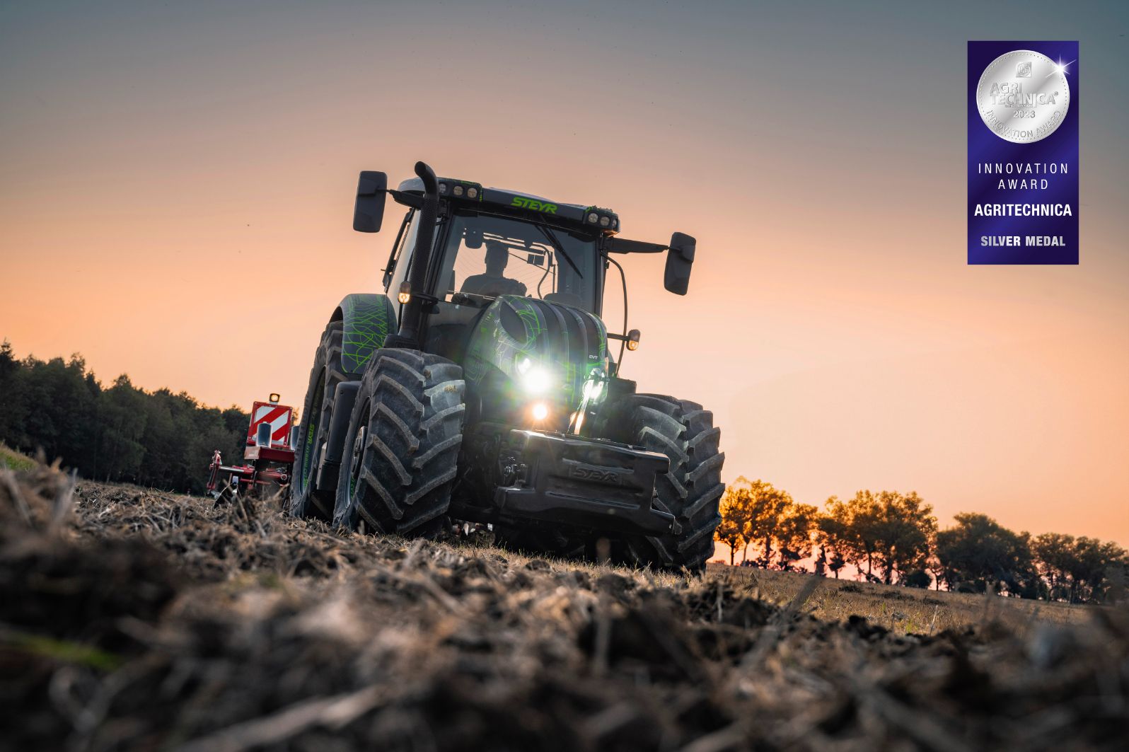 De Steyr Hybrid CVT-tractor, die op Agritechnica 2023 voor het eerst aan het grote publiek wordt getoond, is bij de Agritechnica Innovations Awards onderscheiden met een zilveren medaille, als blijk van erkenning van de verschillende concepten die erin zijn opgenomen die de effectiviteit en efficiëntie van de tractor verhogen.