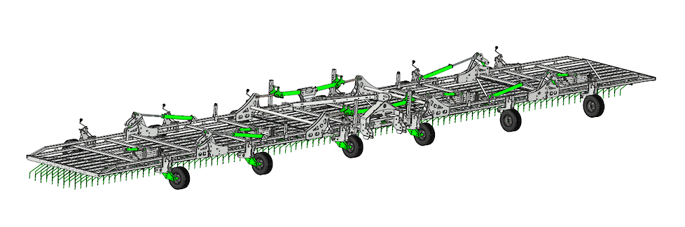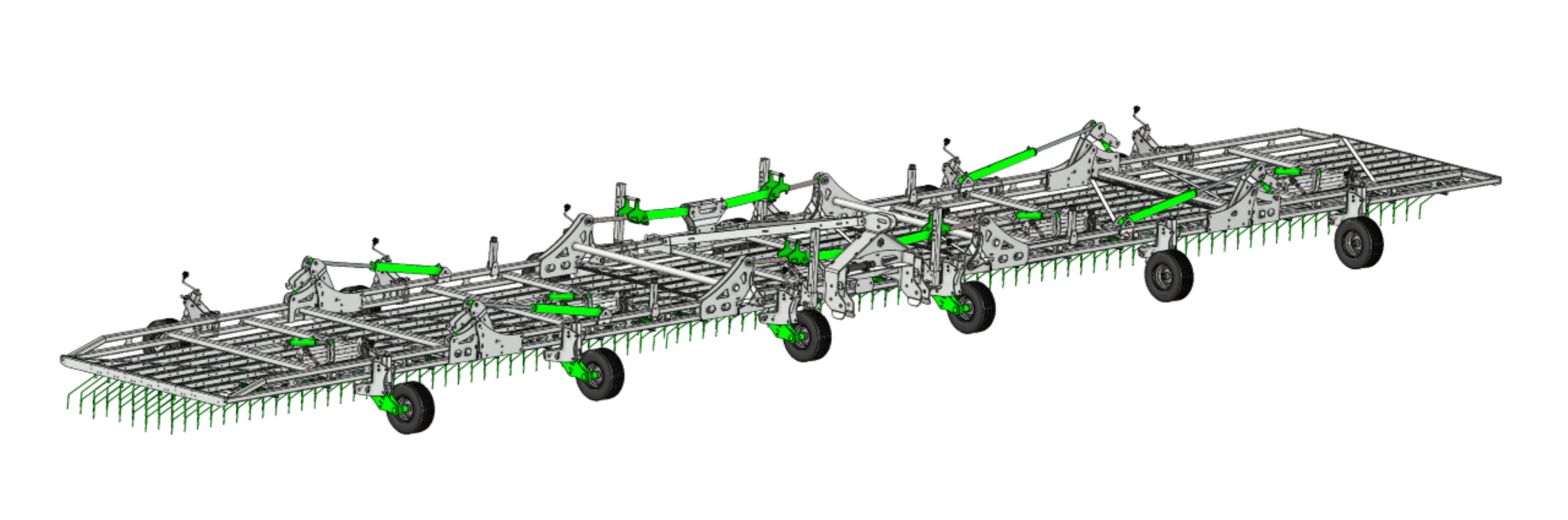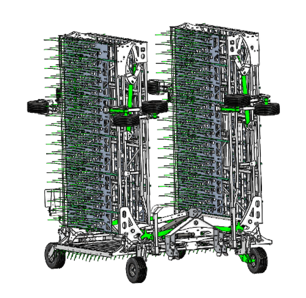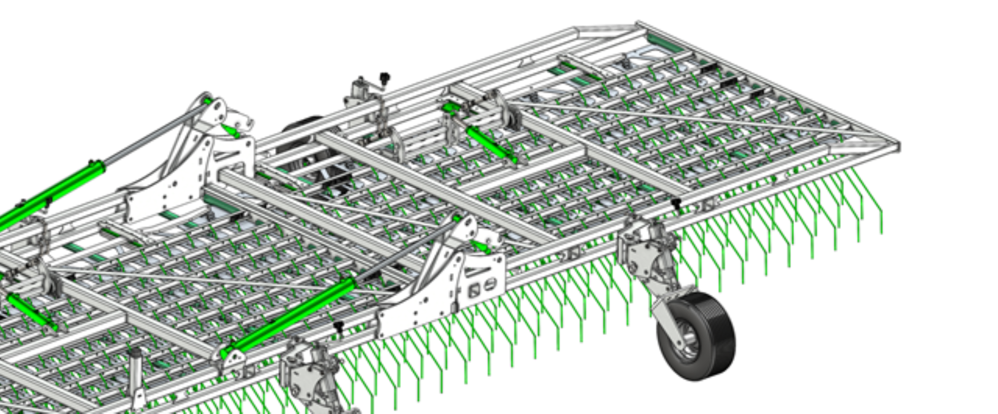 De tandendruk op de 7 mm tanden wordt hydraulisch ingesteld door het subframe met rvs-platen te verstellen, welke direct onder het hoofdframe zit. Dit rvs-subframe zorgt voor een gelijkmatige druk op de tanden op elke werkhoogte (zowel bovenop als onderop de rug), welke kan variëren van 100 gram tot 5 kg. In een streven zoveel mogelijk tanden (683 stuks bij een 15 m machine) in de machine te monteren, is er gekozen voor zeven tandrijen. De machine kent een hoge bodemvrijheid en de tanden hebben een tandhoek van 130 graden. Het zware frame zorgt ervoor dat de wiedeg zeer stabiel over het veld loopt, wat de precisie ten goede komt. Door de vele instelmogelijkheden kan de wiedeg zowel slepend als ook behoorlijk stekend worden gezet, waardoor deze in vrijwel alle gewassen en stadia te gebruiken is en is de werking optimaal om de plant te beschermen en onkruid de baas te zijn. De wiedeg is daarmee geschikt voor zowel zand- als kleigronden en is ook als korstenbreker in te zetten. Ondanks het hoge aantal tanden is er door de grote bodemvrijheid en de zeven tandenrijen veel ruimte in de machine.