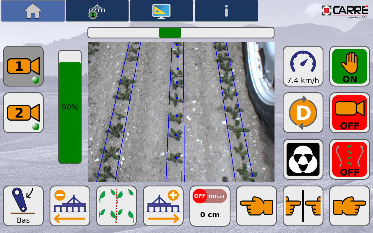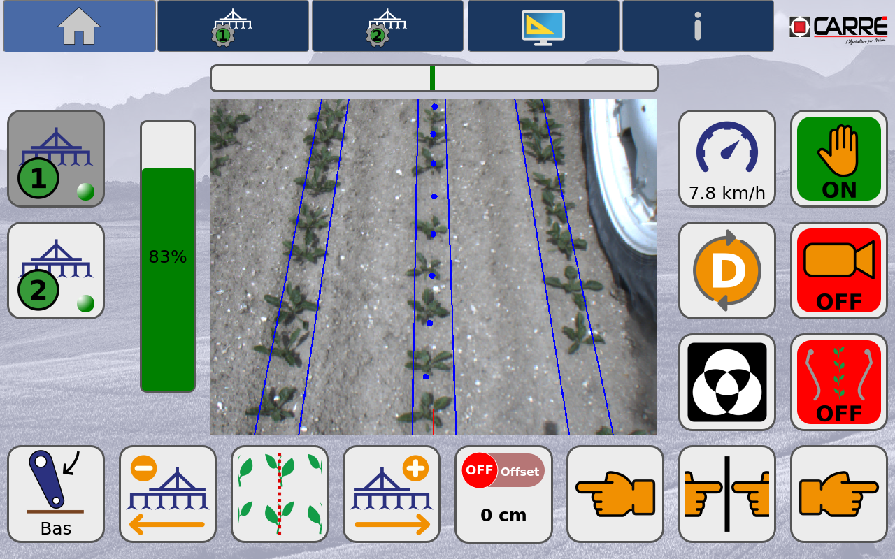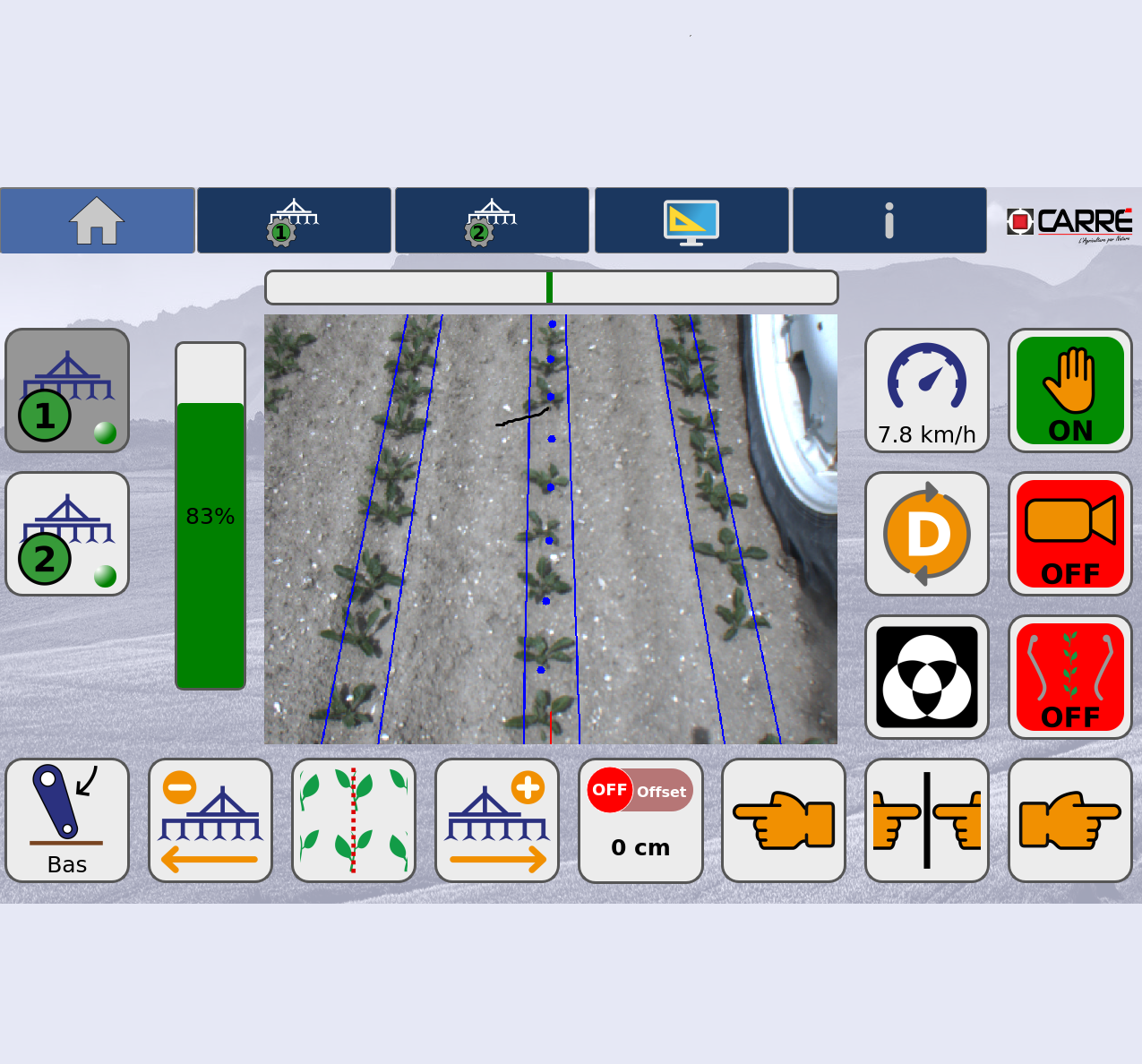 In 2007 was Carré de eerste fabrikant die camera's op zijn schoffels aanbood. De Kipline-camera, die hedendaags op Carré-machines wordt gebruikt, is ontworpen om effectiever te zijn in complexe situaties. Dat wil zeggen daar waar sprake is van een hoge onkruiddichtheid en waar wordt gewerkt met een smalle rijafstand. Het Kipline-camerasysteem op schoffelmachines is nu beschikbaar met een dubbele camera voor cameradetectie aan twee zijden. Deze optie garandeert een nauwkeurige geleiding van de schoffelmachine bij lage opkomst of bij percelen met veel geren. In dit geval combineert de terminal de weergave en instellingen van de twee camera's en bepaalt automatisch de camerakeuze om de begeleiding te regelen op basis van de analyseprestaties. Door de ergonomie en het gebruiksgemak van de aanraakgevoelige console is de bediening eenvoudig. Het scherm bevat een real-time videoweergave van het gebied dat door de camera wordt geanalyseerd, waardoor de bestuurder weet dat de werkzaamheden soepel en nauwkeurig verlopen. De Kipline dubbele camera maakt het gemakkelijk om met complexe situaties om te gaan!. De optie is direct beschikbaar voor het gehele assortiment schoffels en geleidingssystemen.