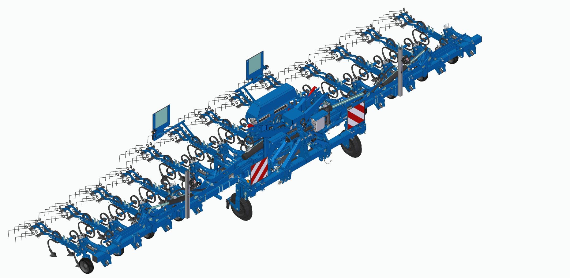 Het Kipline-camerasysteem biedt de mogelijkheid om met één terminal een dubbele side-shift aan te sturen. Hierdoor is het mogelijk om twee autonome schoffels te combineren voor geleiding op hetzelfde chassis. Hierdoor kunnen bijvoorbeeld twee zaaigangen van 6 meter tegelijk geschoffeld worden. Door twee zaaimachinebreedtes te schoffelen, kunt u de opbrengst per hectare verdubbelen. Hierdoor wordt het schoffelproces geoptimaliseerd, waardoor de kosten aanzienlijk worden verlaagd. De terminal beheert de instellingen en individuele bediening van elke schoffel, en de machinist heeft permanente visuele controle over de ene of andere schoffel. De machine is leverbaar tot 12 meter werkbreedte vanaf juli 2024.