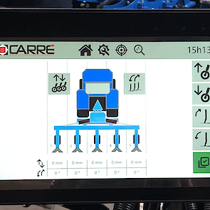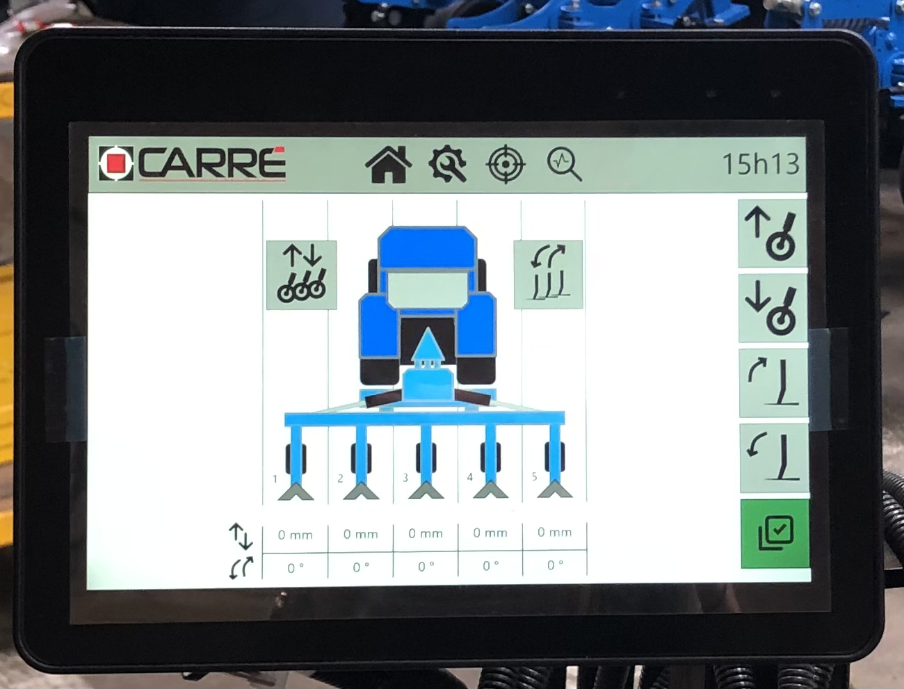 Carré-schoffelmessen zijn ontworpen om ervoor te zorgen dat het grondoppervlak op een constante diepte wordt gescalpeerd, dankzij de individuele bediening van elk element. Deze aanpassing gebeurt eenvoudig en moeiteloos vanuit de cabine via een bedieningsmonitor. Een elektrische actuator stuurt rechtstreeks het dieptewiel van het schoffelelement aan. Bovendien bevat elk schoffelelement een innovatief veersysteem dat de tanden ondersteunt door middel van een non-stop veerveiligheidssysteem (steenbeveiliging). Het maakt ook een snelle, nauwkeurige aanpassing van de hoek van de schaar mogelijk met behulp van een elektrische actuator die wordt bestuurd vanaf de monitor in de trekker. De bestuurder kan daardoor de diepte en de invalshoek van de schoffelmessen nauwkeurig instellen, zonder dat hij uit de trekker hoeft te komen. Deze parameters kunnen onmiddellijk worden gewijzigd en zo vaak als nodig worden herhaald om de machine aan te passen aan wisselende omstandigheden in het veld.