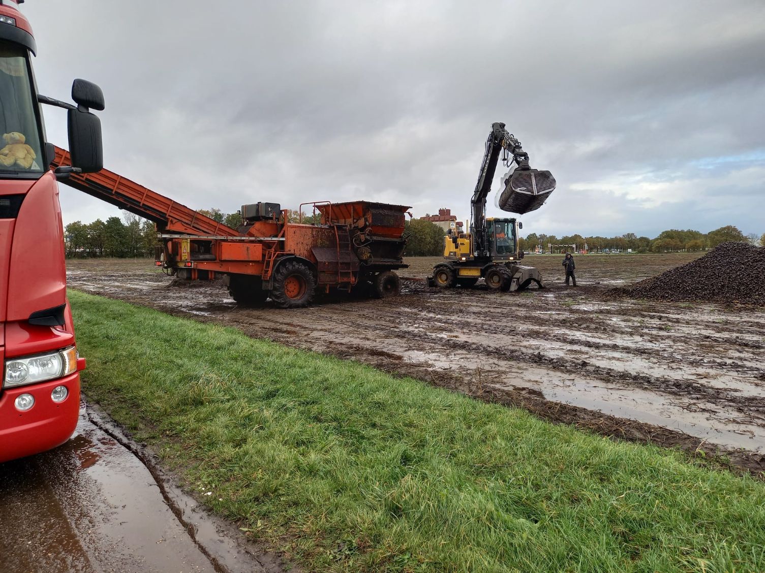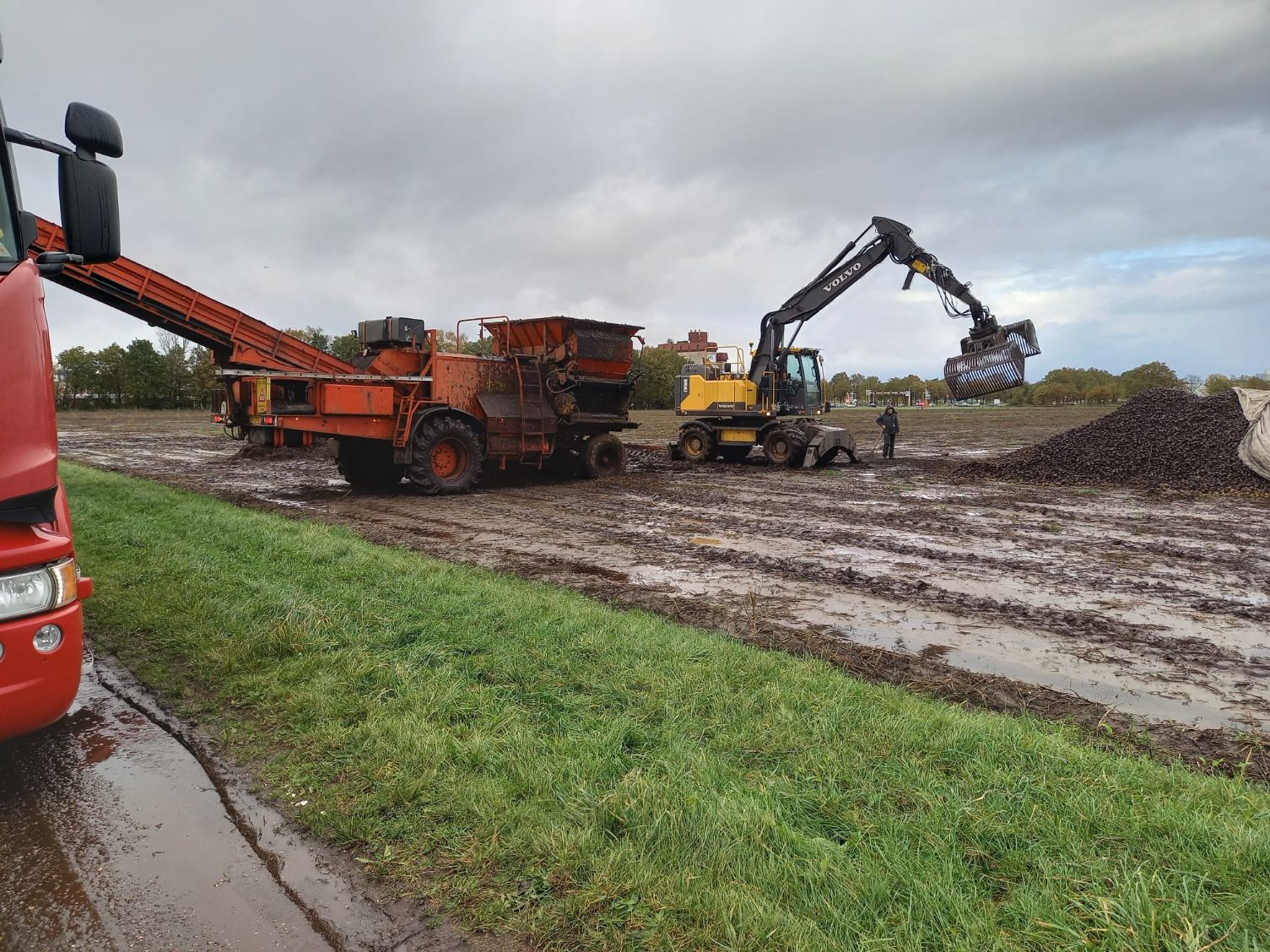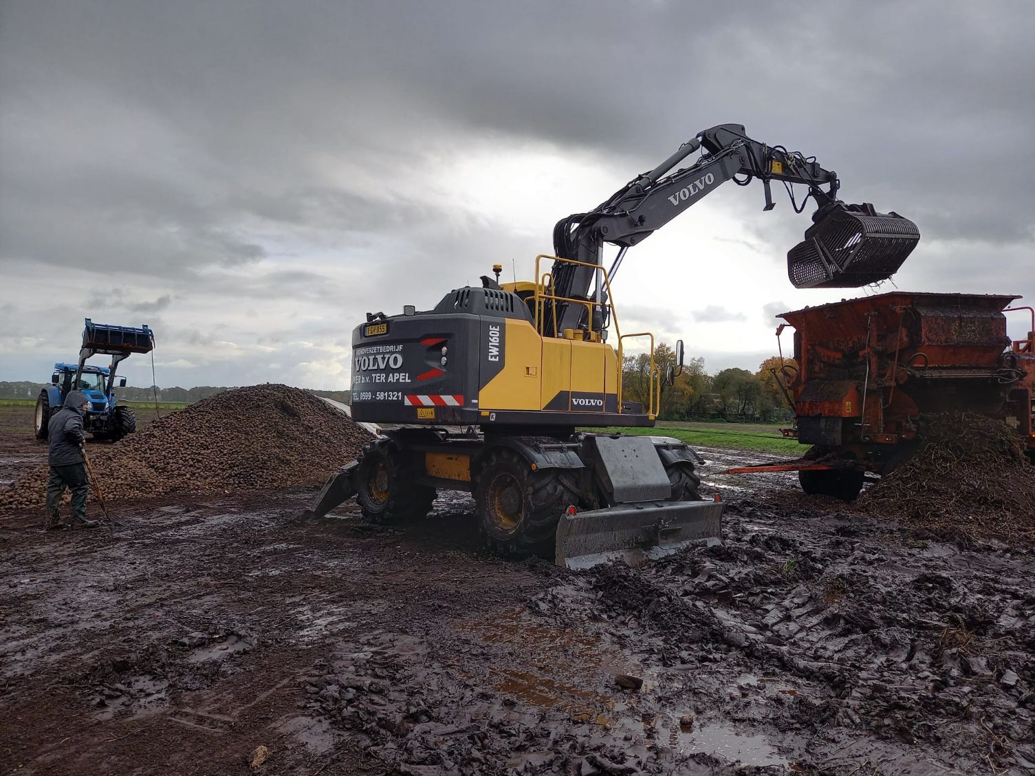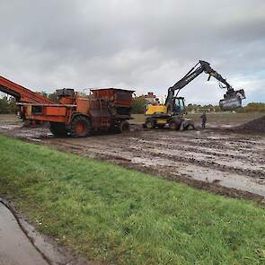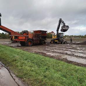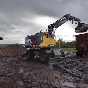 De Volvo-kraan laadt de aardappelen op de transporteur, die ze vervolgens op de vrachtwagen laadt voor transport naar de fabriek van Avebe om daar verwerkt te worden tot zetmeel.