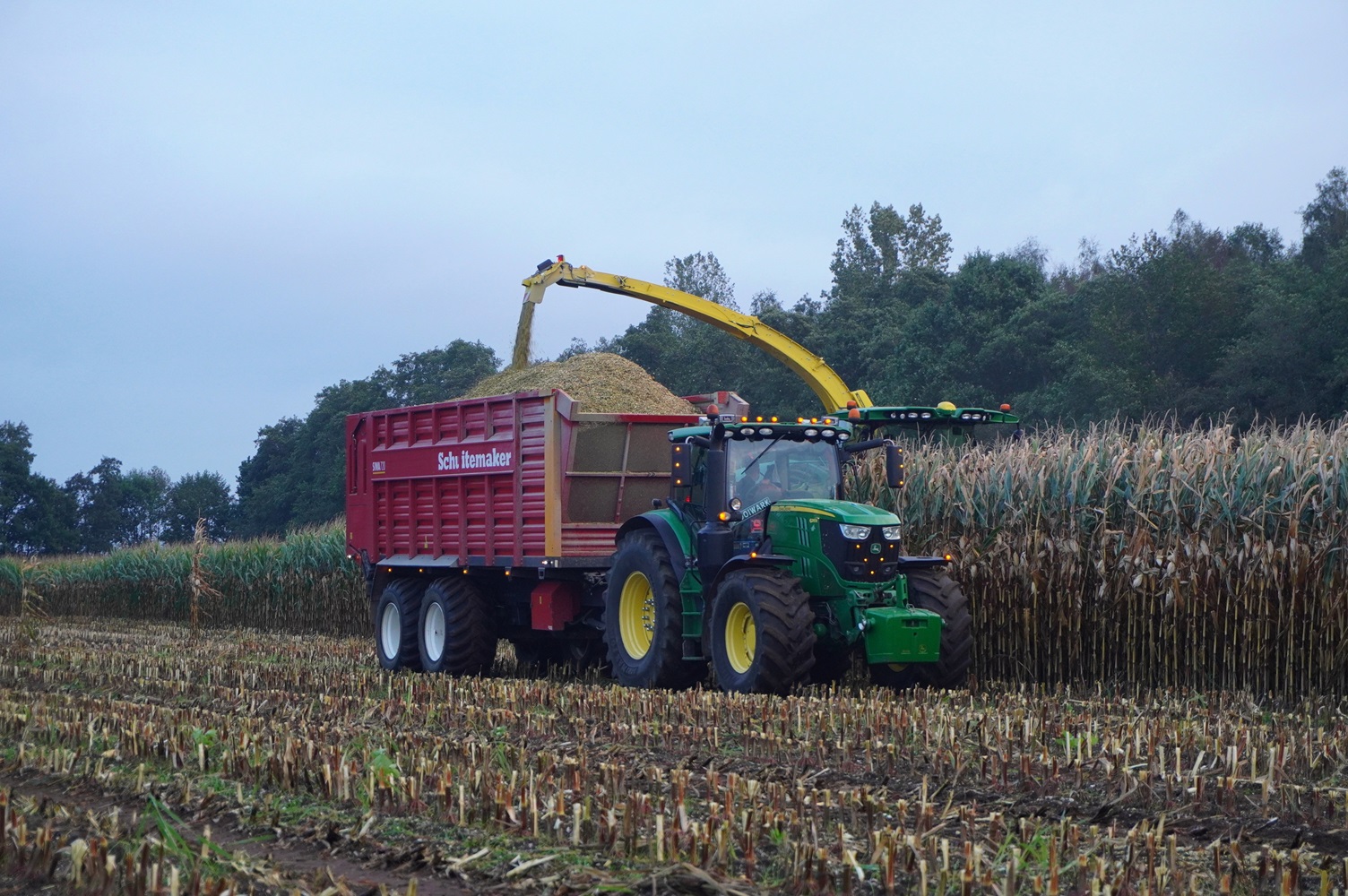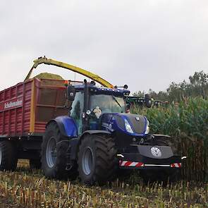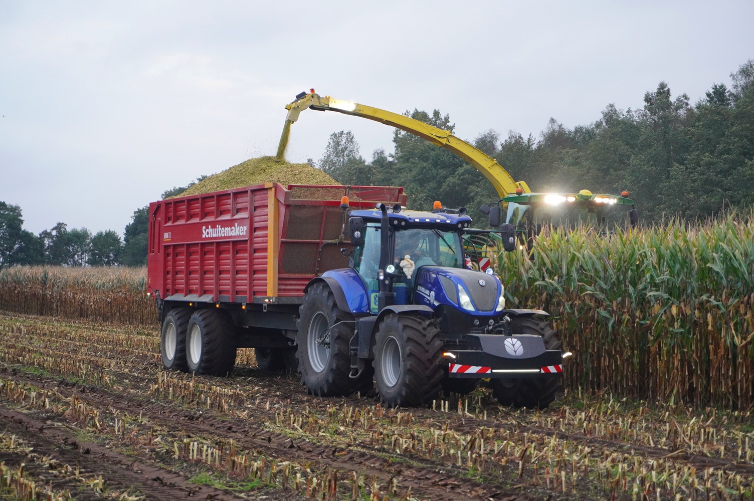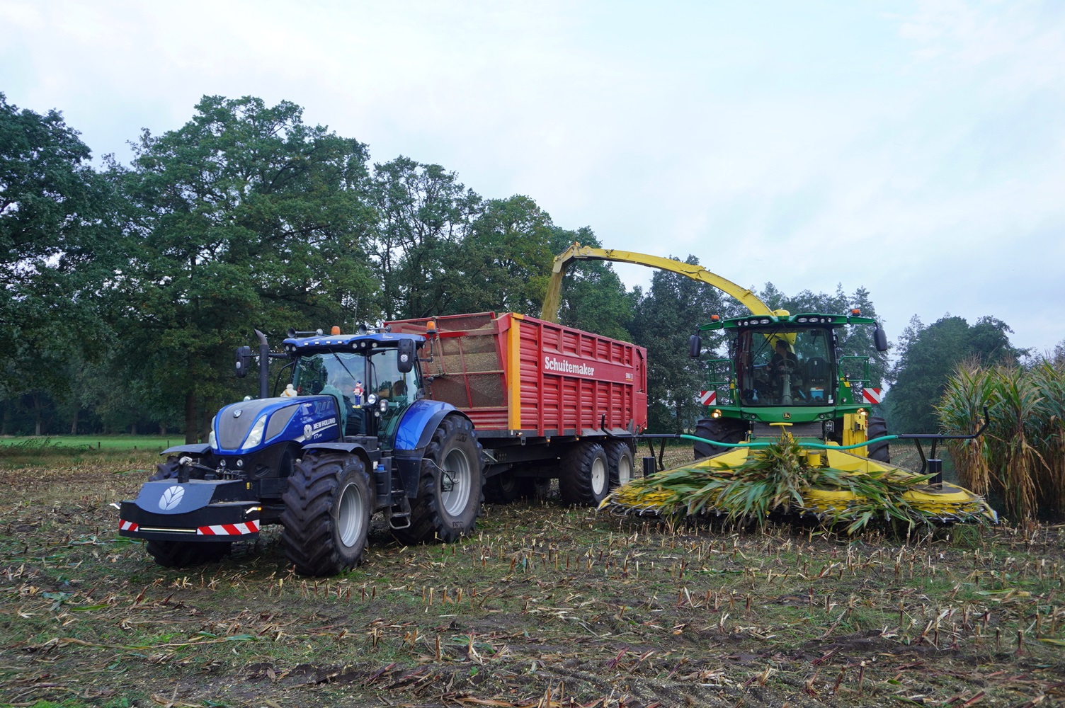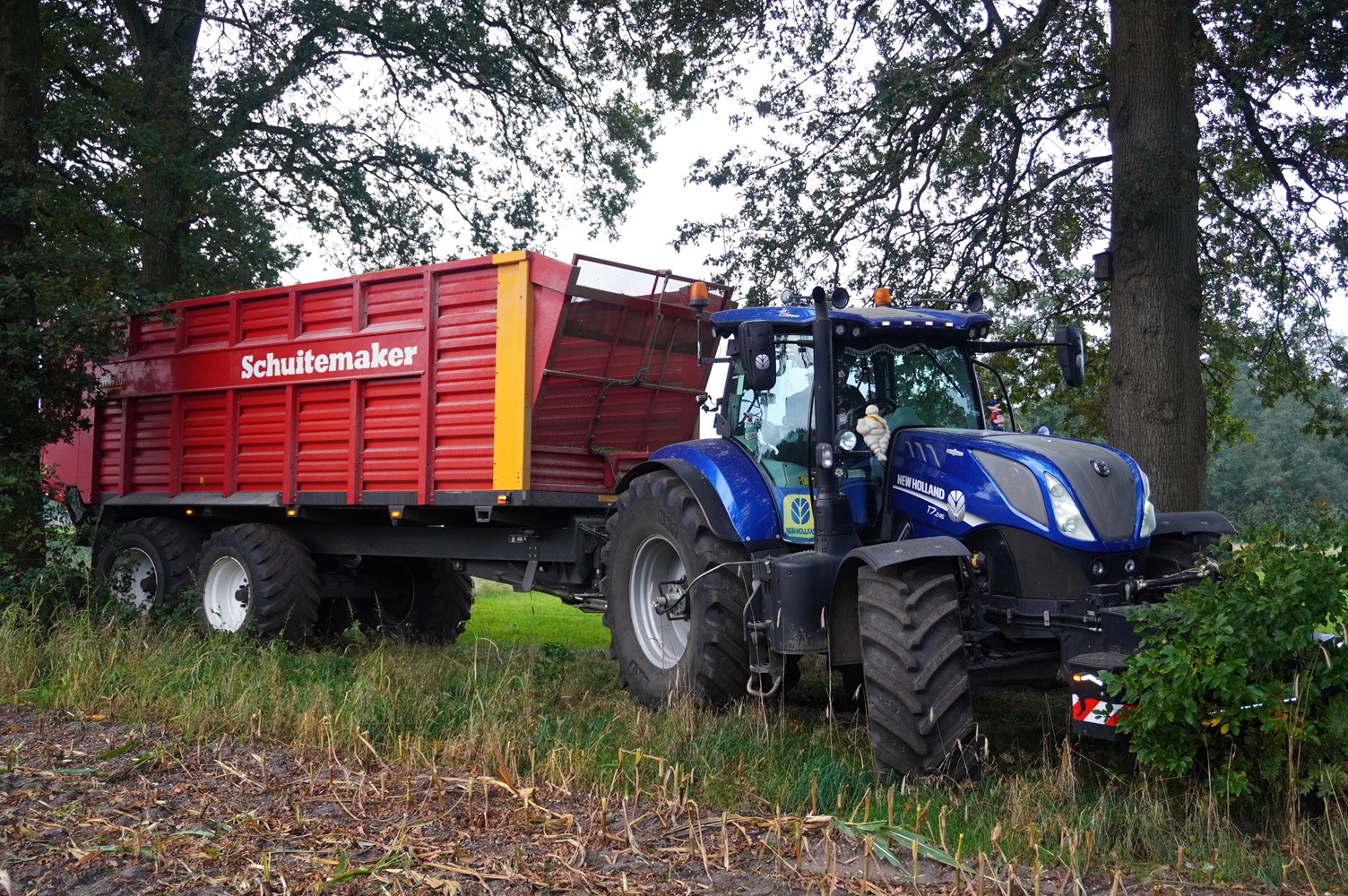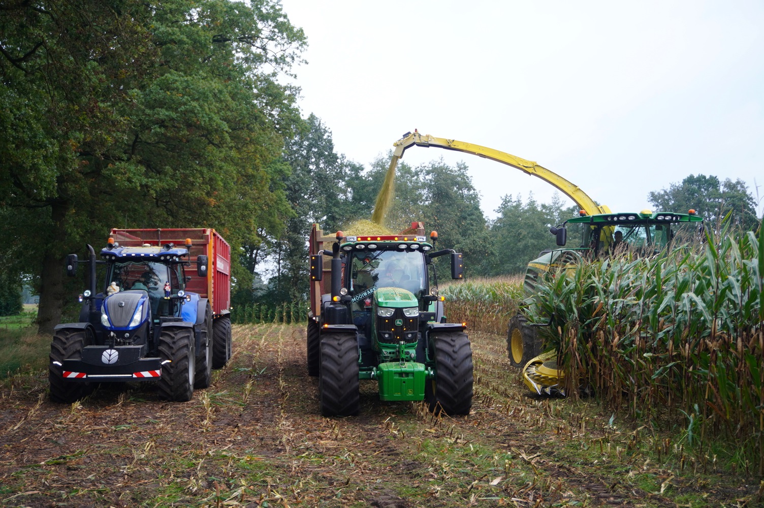 Loonbedrijf Fa. ten Voorde uit Terwolde (GD) aan het maïs hakselen met een John Deere 8400i, een New Holland T7.245 Blue Power en een John Deere 6215R met Schuitemaker Siwa 720.