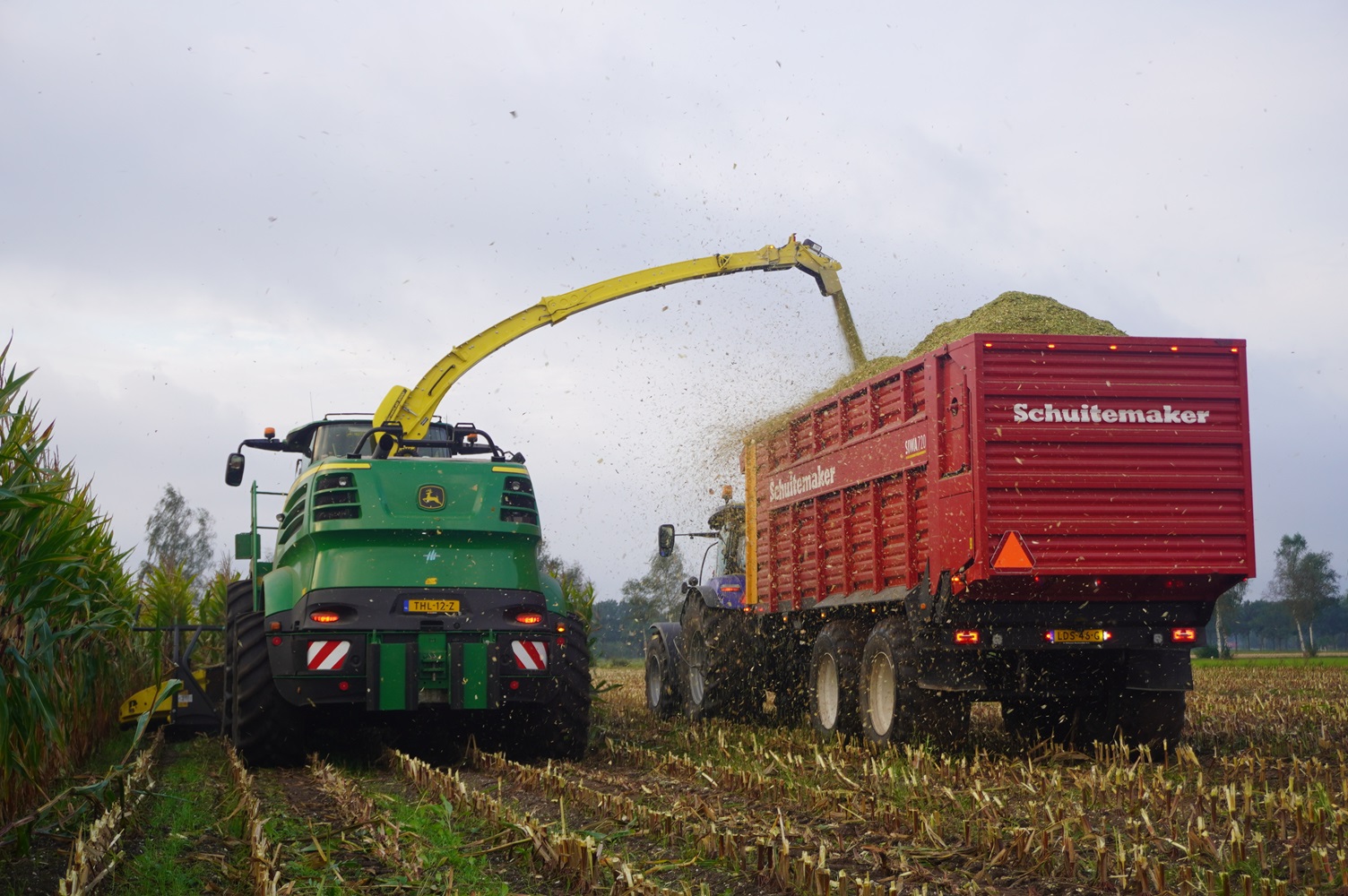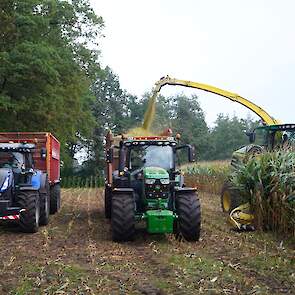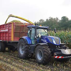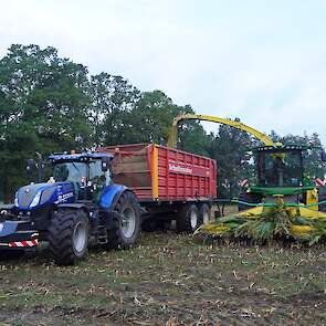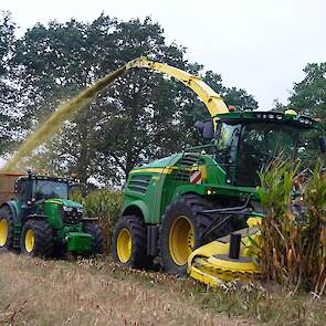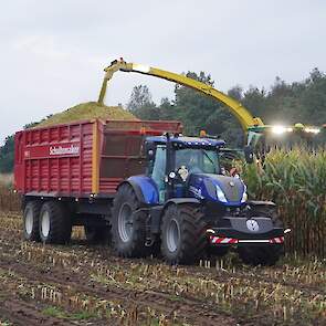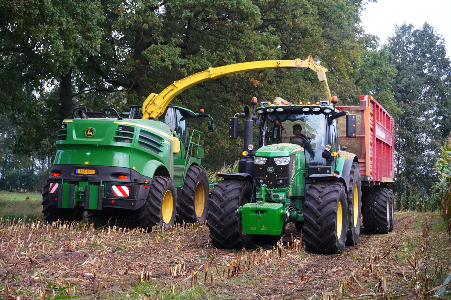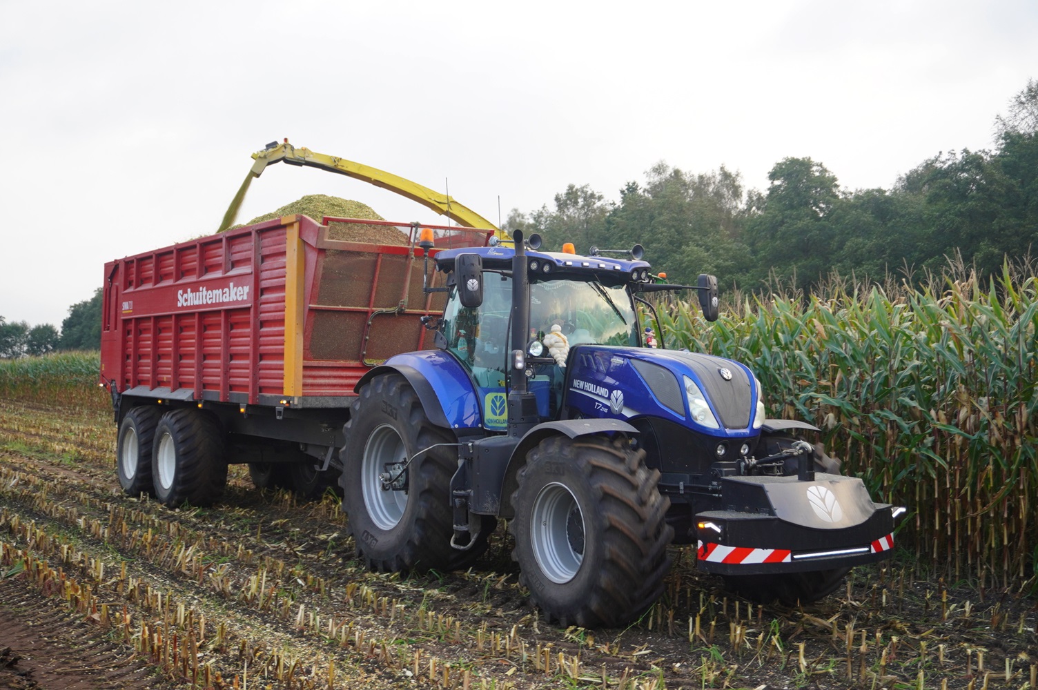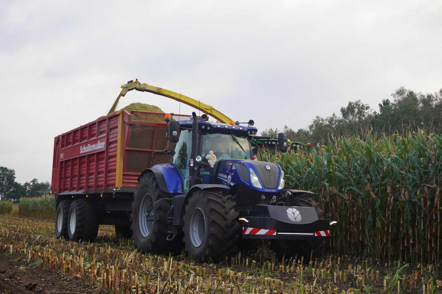 Loonbedrijf Fa. ten Voorde uit Terwolde (GD) aan het maïs hakselen met een John Deere 8400i, een New Holland T7.245 Blue Power en een John Deere 6215R met Schuitemaker Siwa 720.