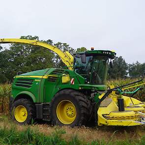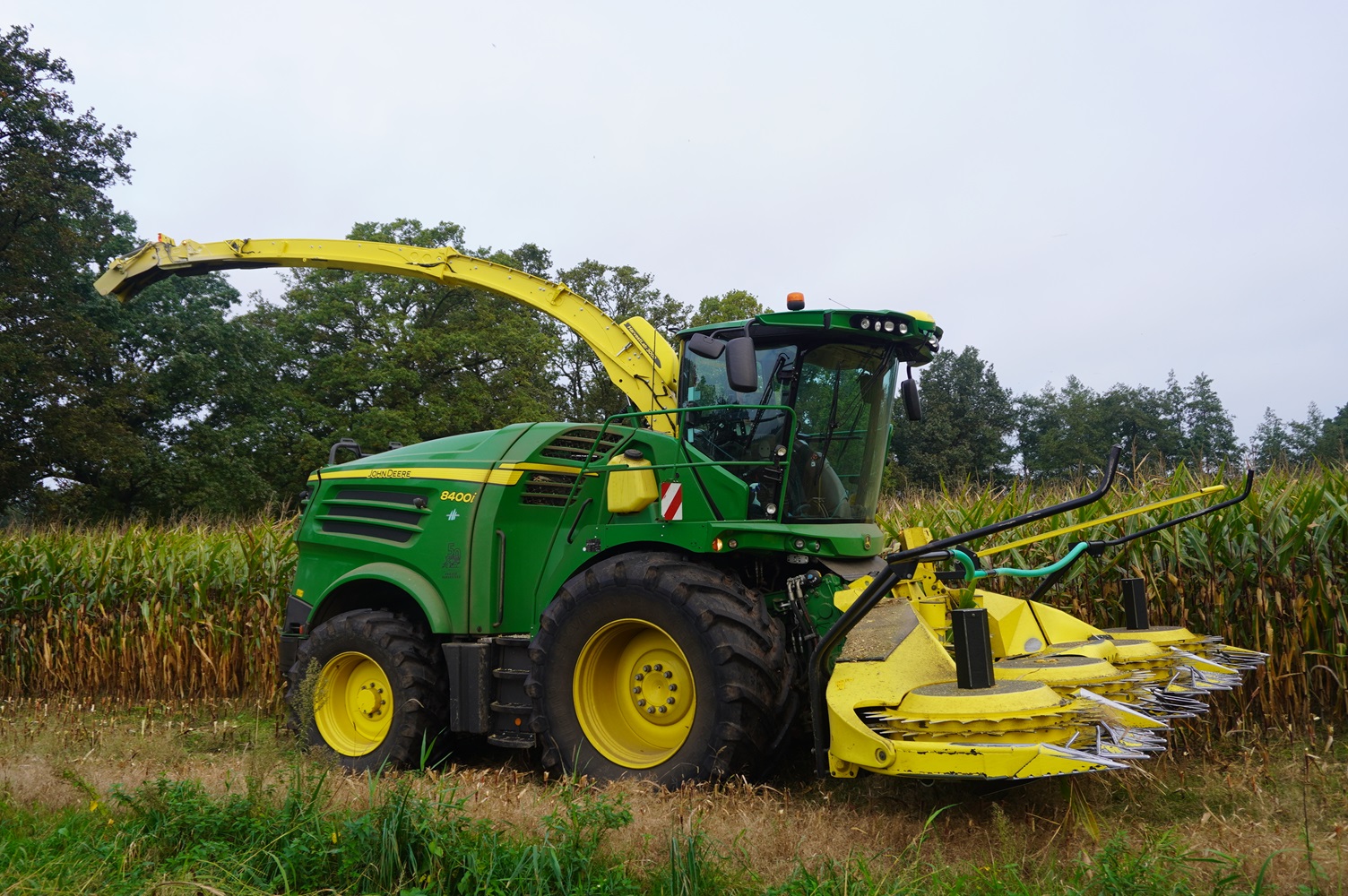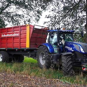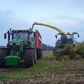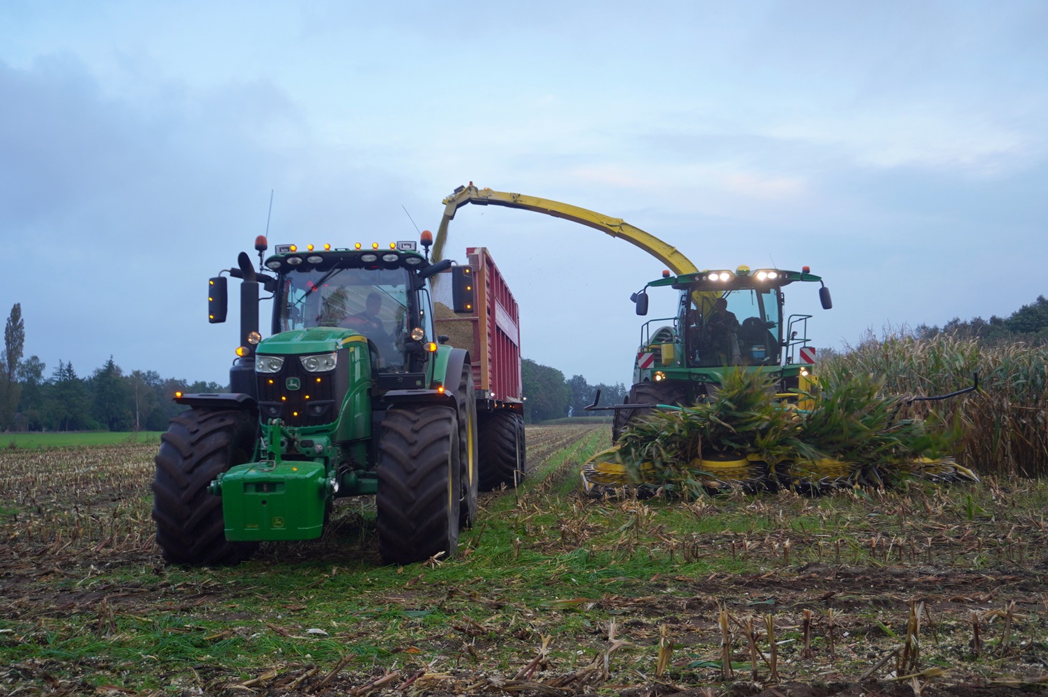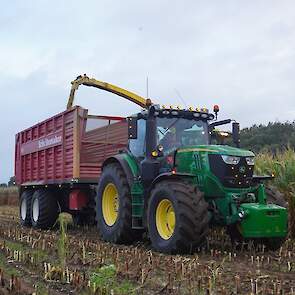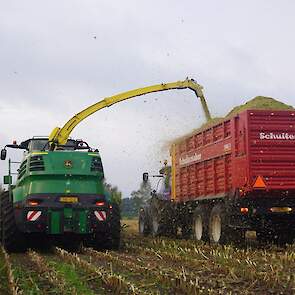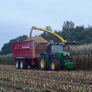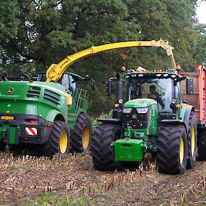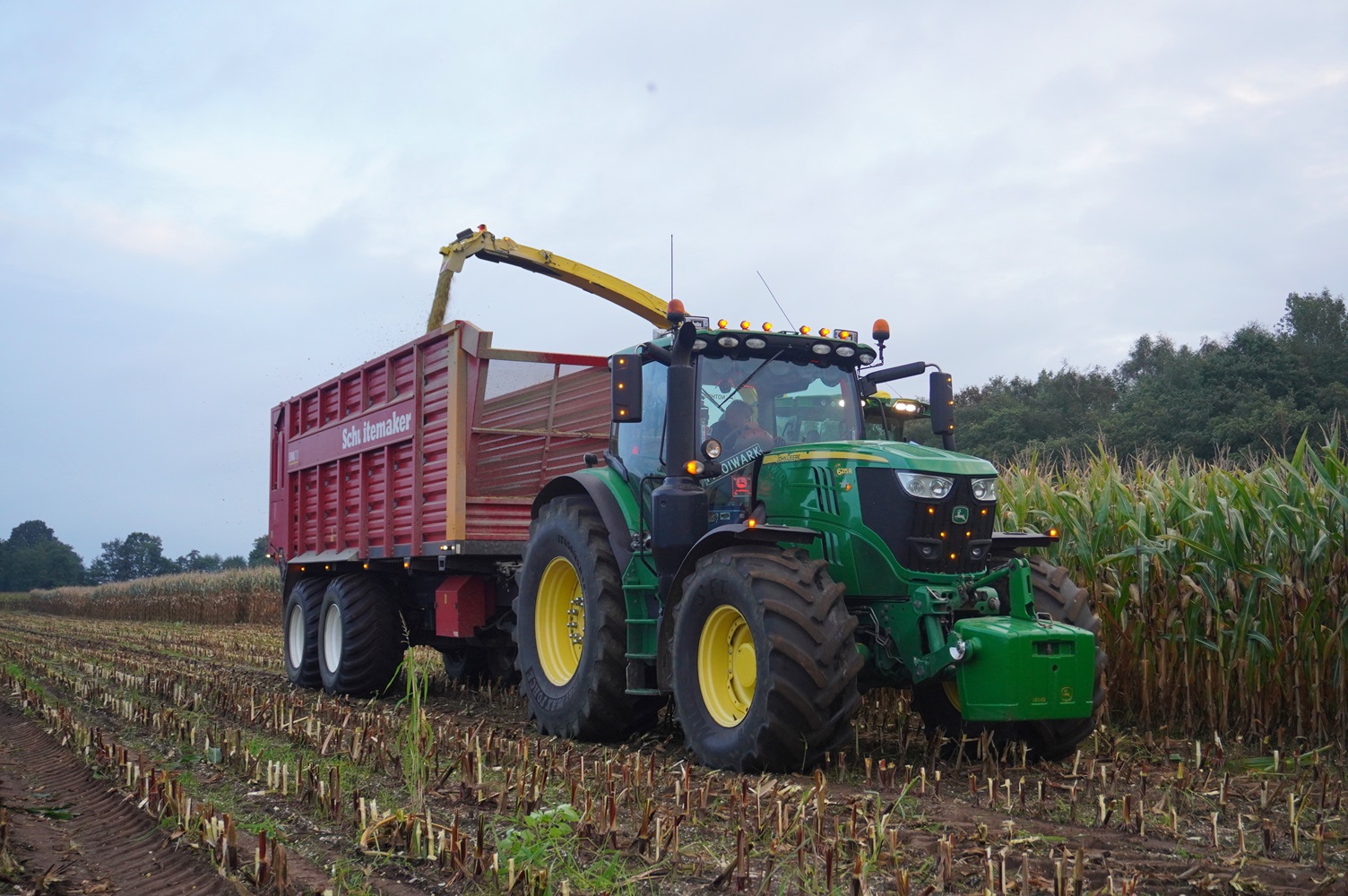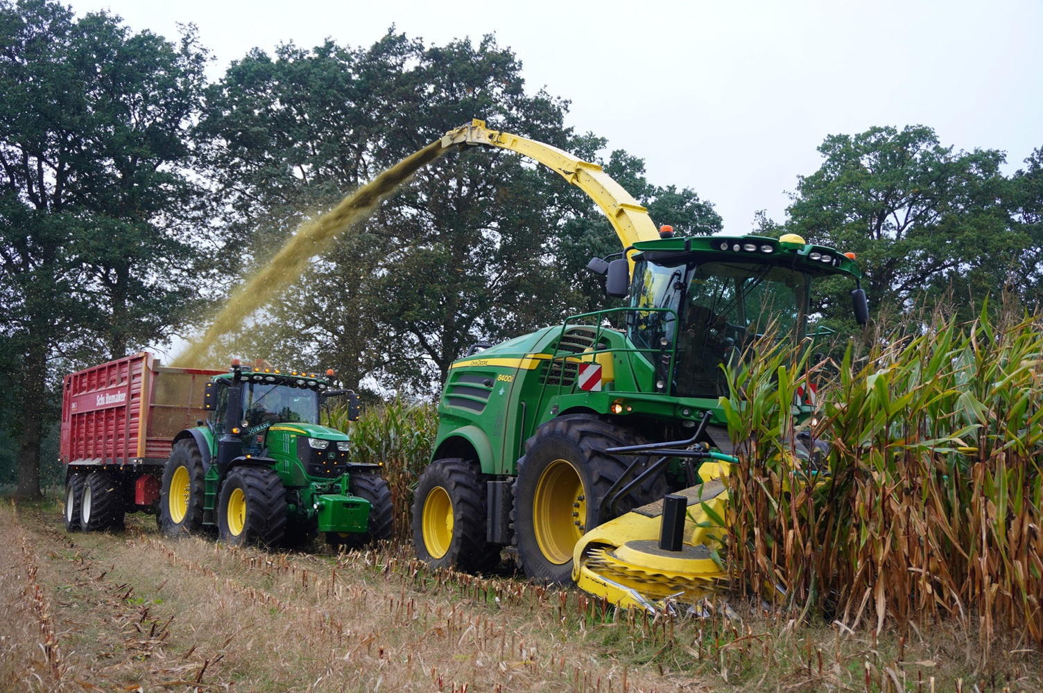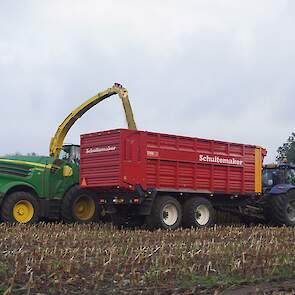 Loonbedrijf Fa. ten Voorde uit Terwolde (GD) aan het maïs hakselen met een John Deere 8400i, een New Holland T7.245 Blue Power en een John Deere 6215R met Schuitemaker Siwa 720.