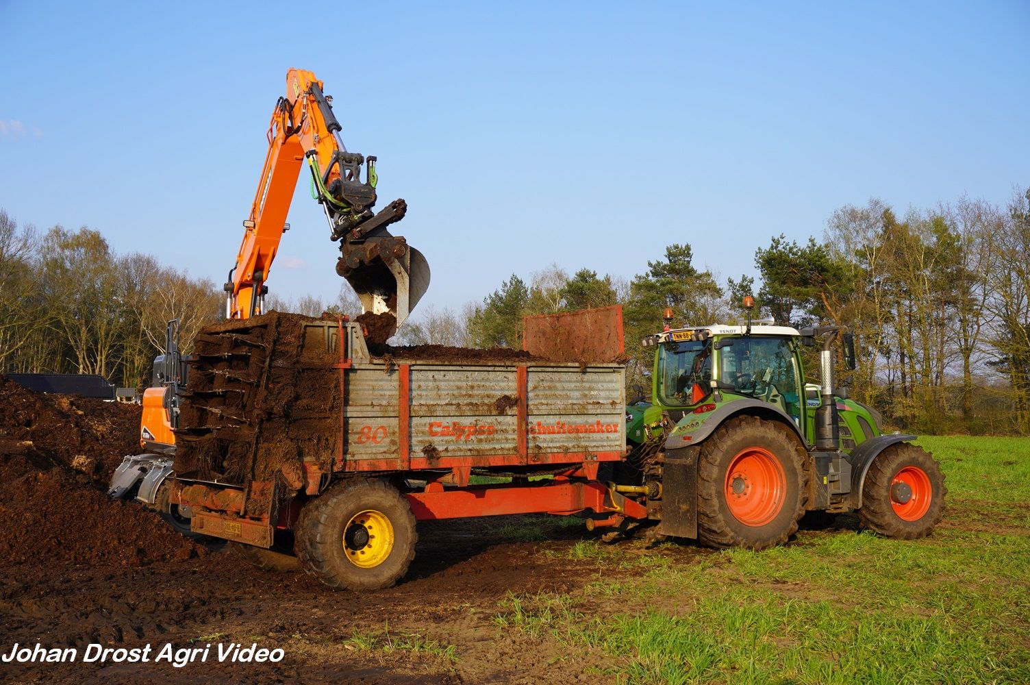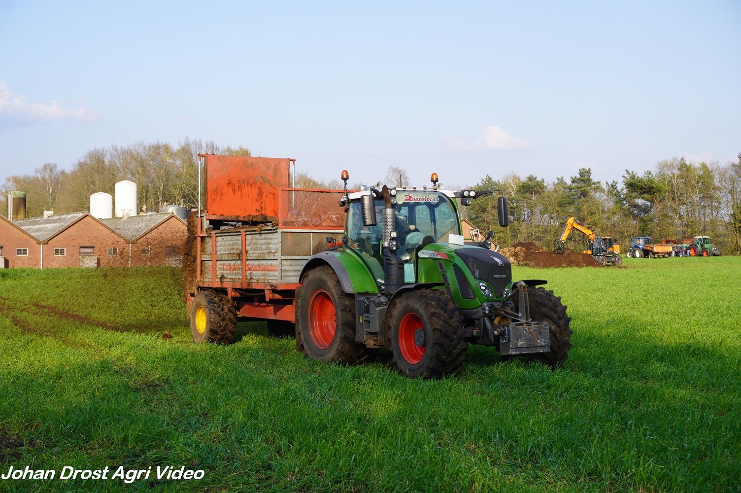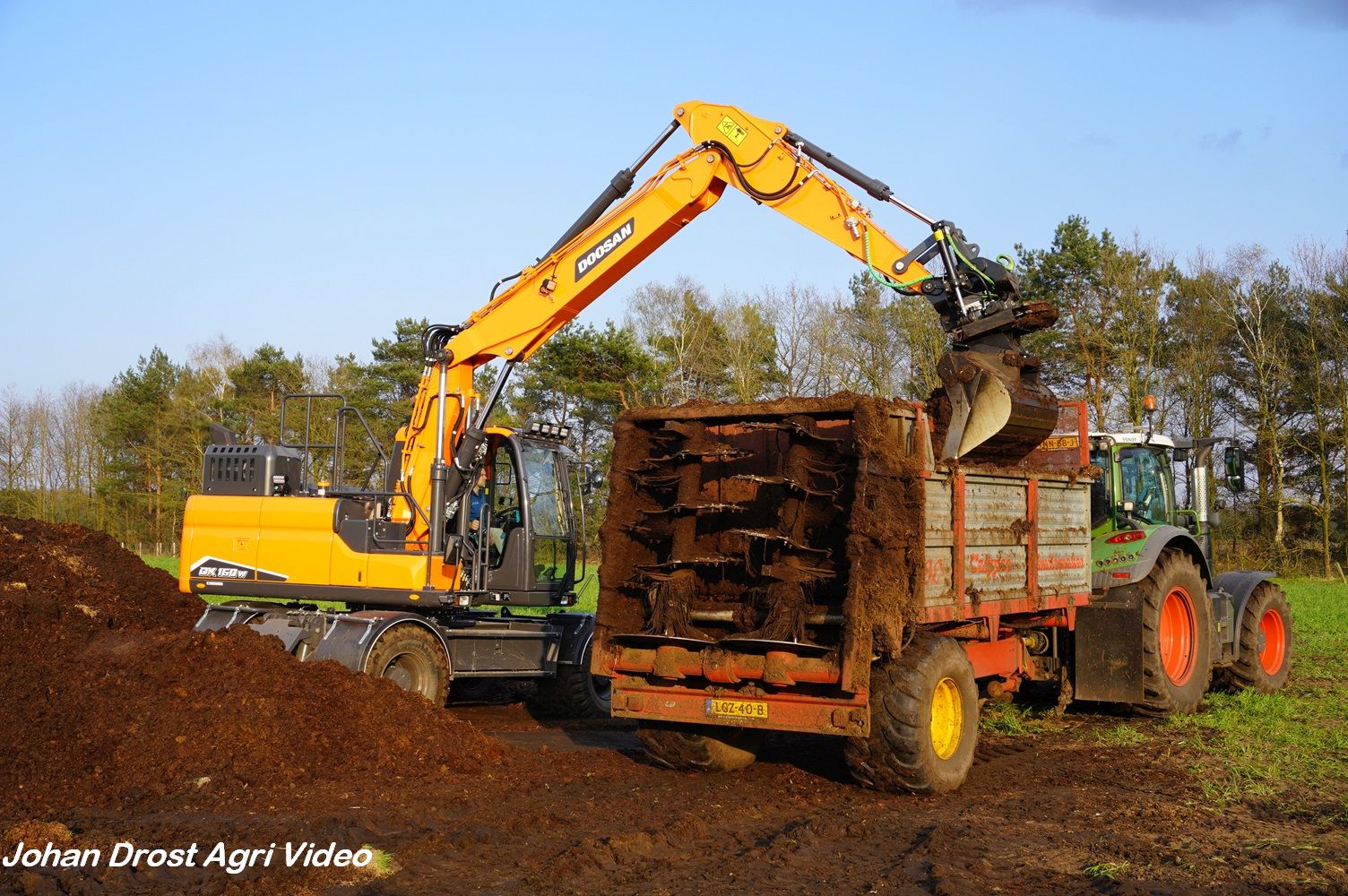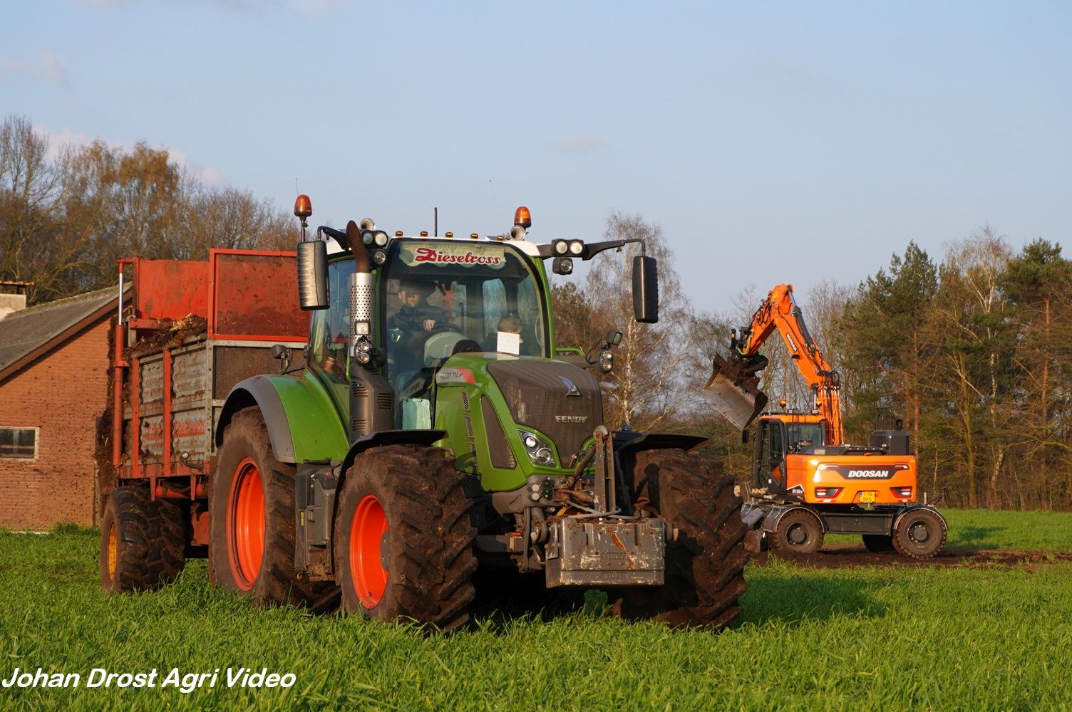 Loonbedrijf P. van den Hardenberg uit Elspeet (GD) en Van de Steeg Grondverzet uit Uddel (GD) aan het vaste mest laden en strooien met een Fendt 714 Vario en Schuitemaker Calypso 80-meststrooier. Voor het laden een Doosan DX 160W.