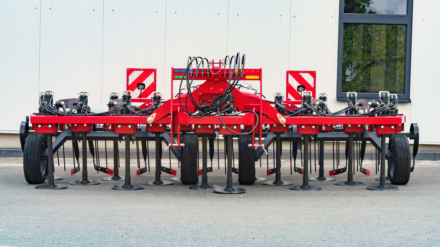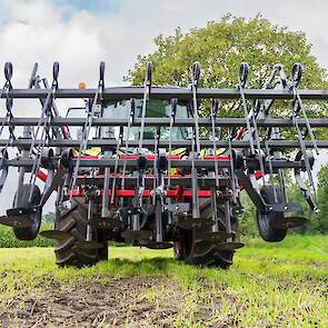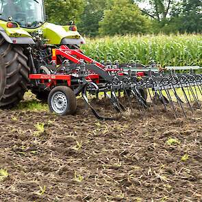 De diepte van de machine wordt hydraulisch versteld d.m.v. de dieptewielen. Door deze te koppelen aan het eggenframe achter de machine, beweegt deze ook mee als de diepte wordt aangepast.