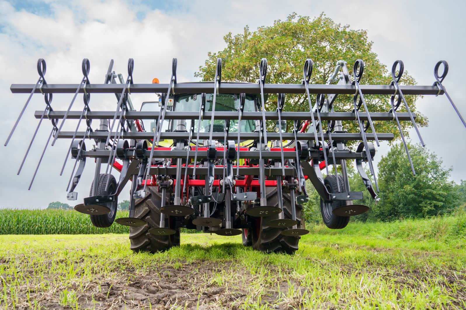 De stelen van de schijven zijn op een gepatenteerde manier onder veerspanning bevestigd. Hierdoor kunnen ze uitwijken als er een obstakel wordt geraakt.