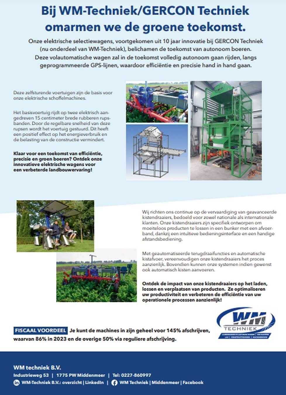 Bij WM-Techniek/Gercon Techniek omarmen we de groene toekomst. Onze elektrische selectiewagens, voortgekomen uit 10 jaar innovatie bij Gercon Techniek (nu onderdeel van WM-Techniek), belichamen de toekomst van autonoom boeren.