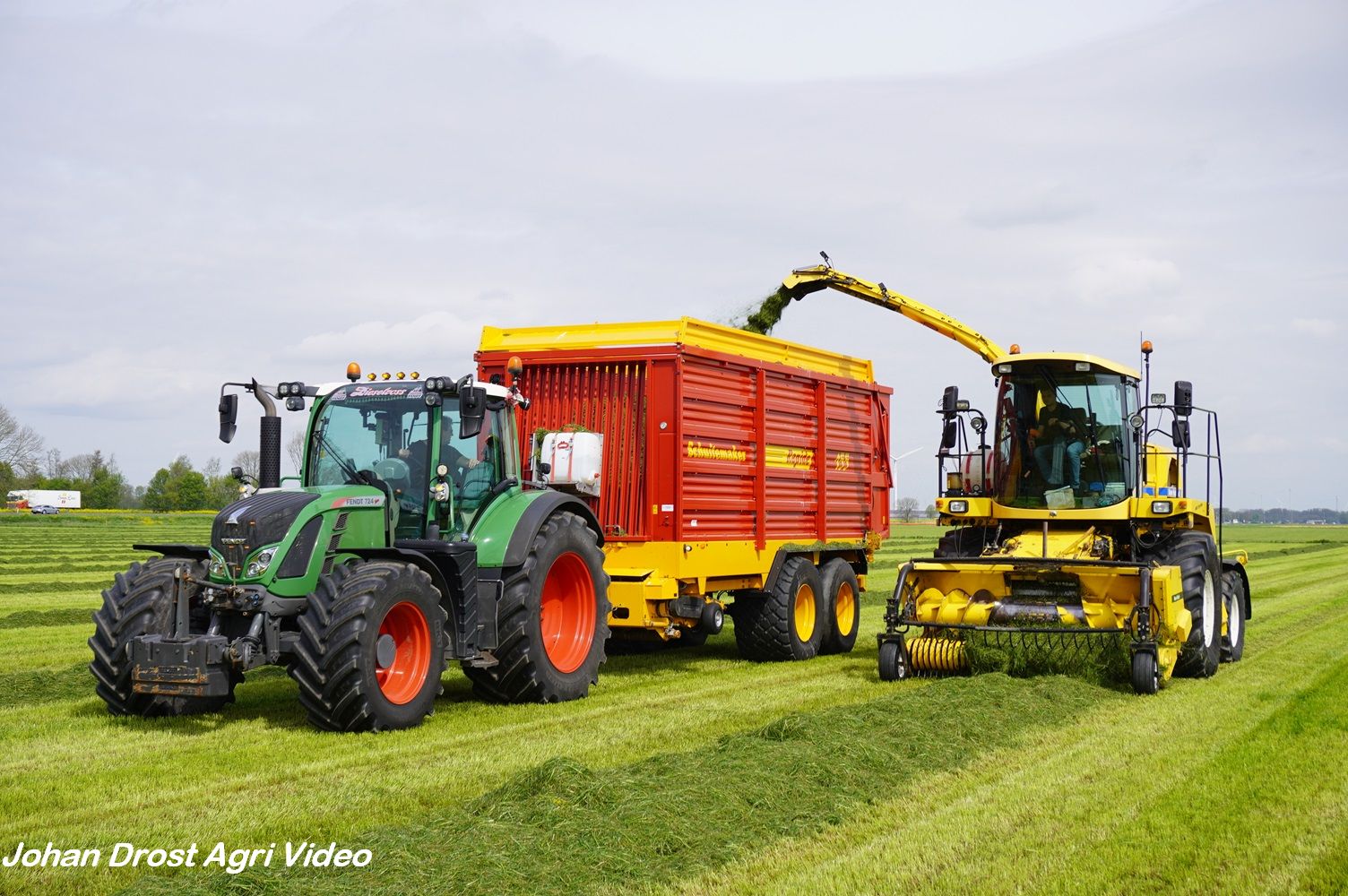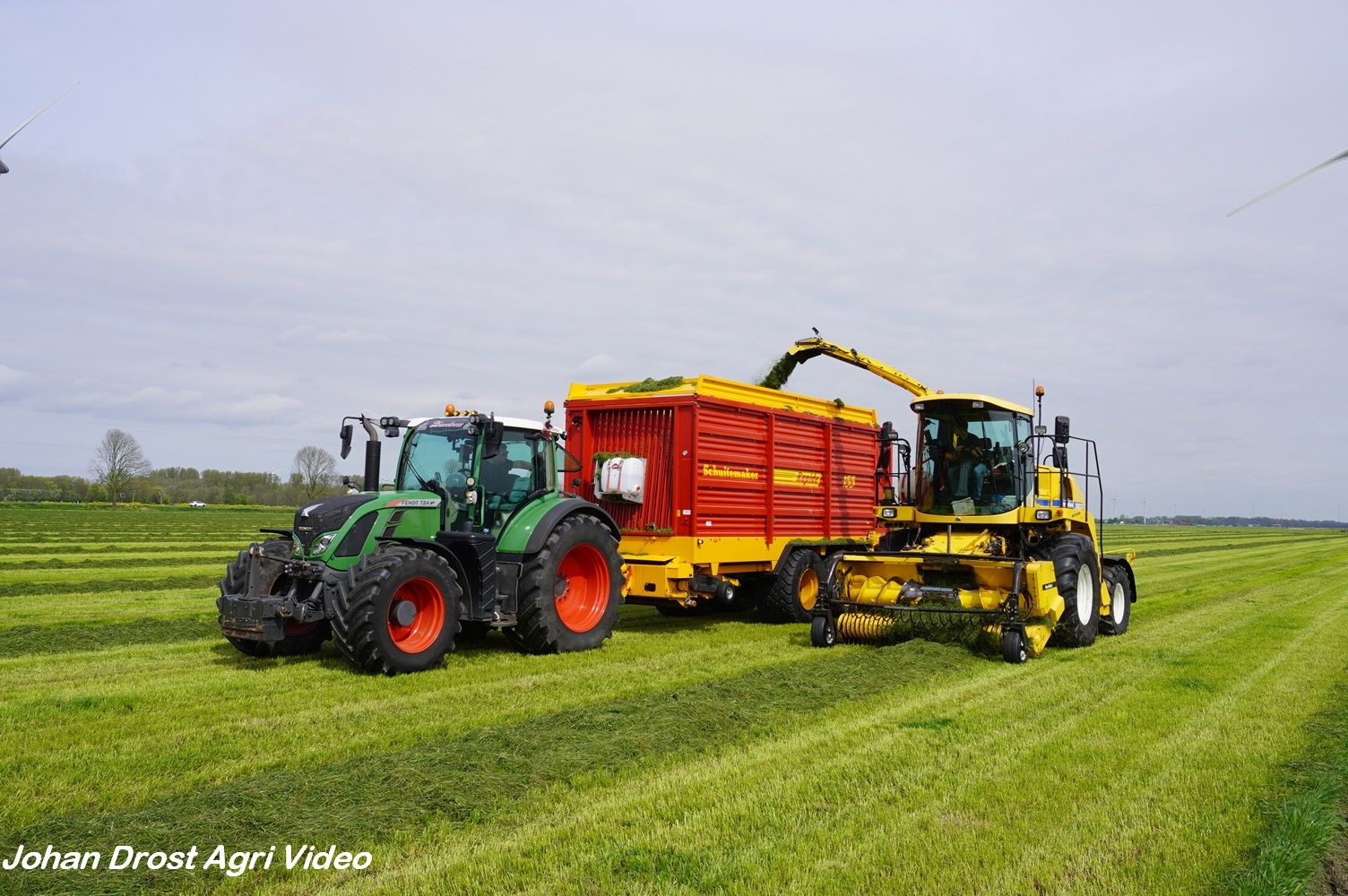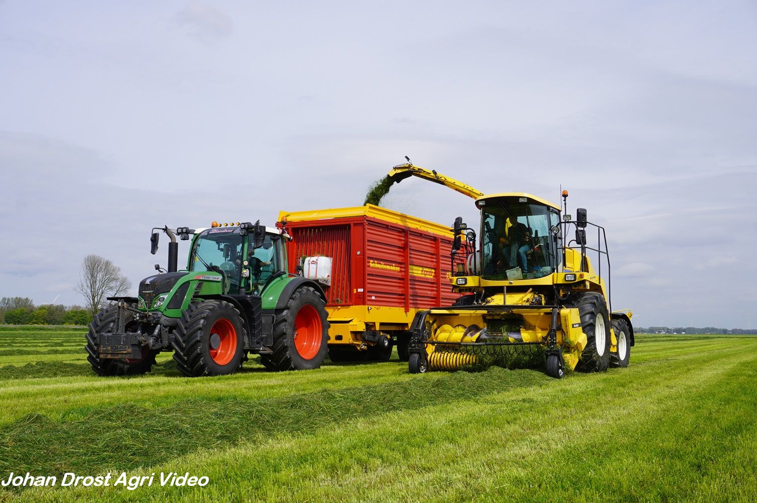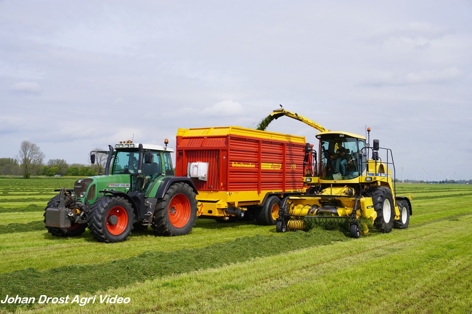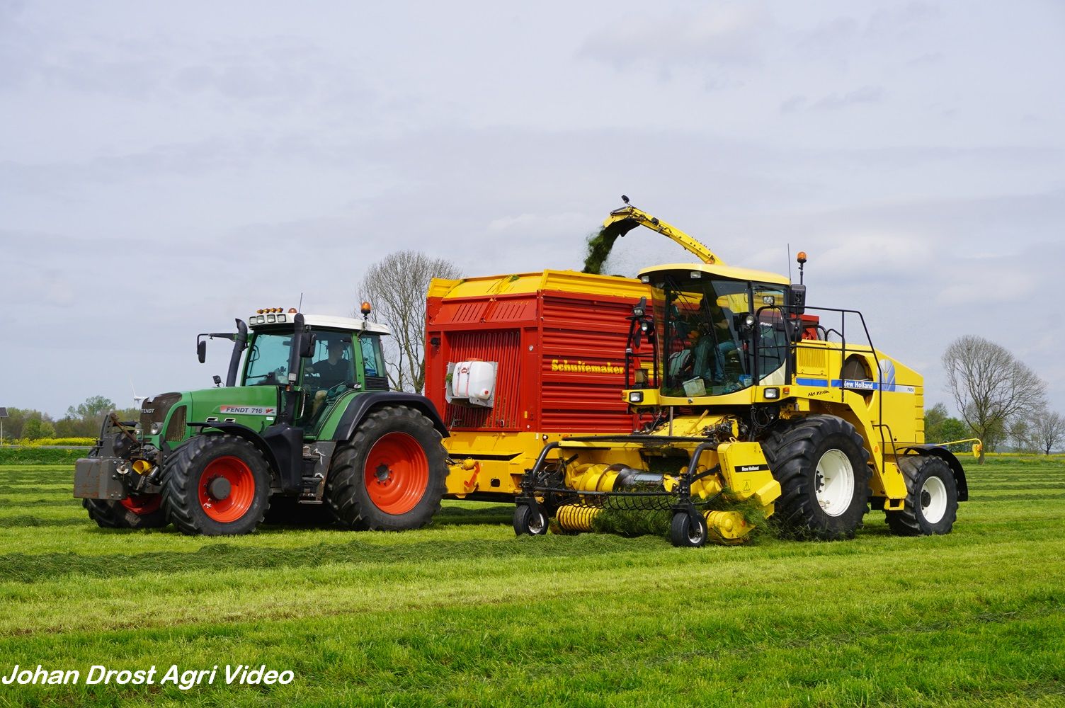 Loonbedrijf Johan Frens uit Hulshorst aan het gras hakselen met een New Holland FX50, Fendt 716 Vario TMS en Fendt 724 Vario met Schuitemaker Rapide 155.