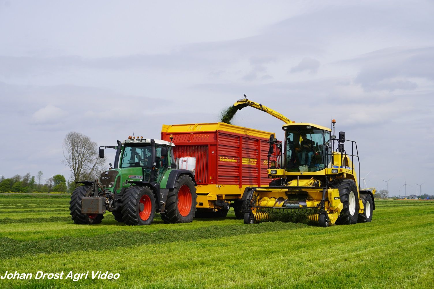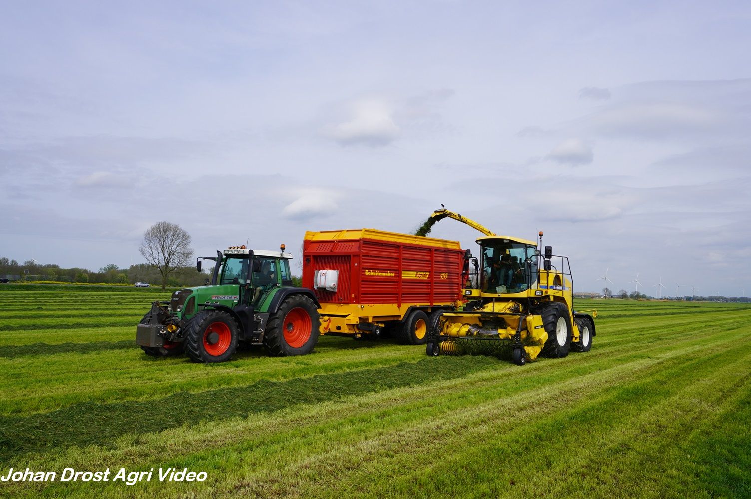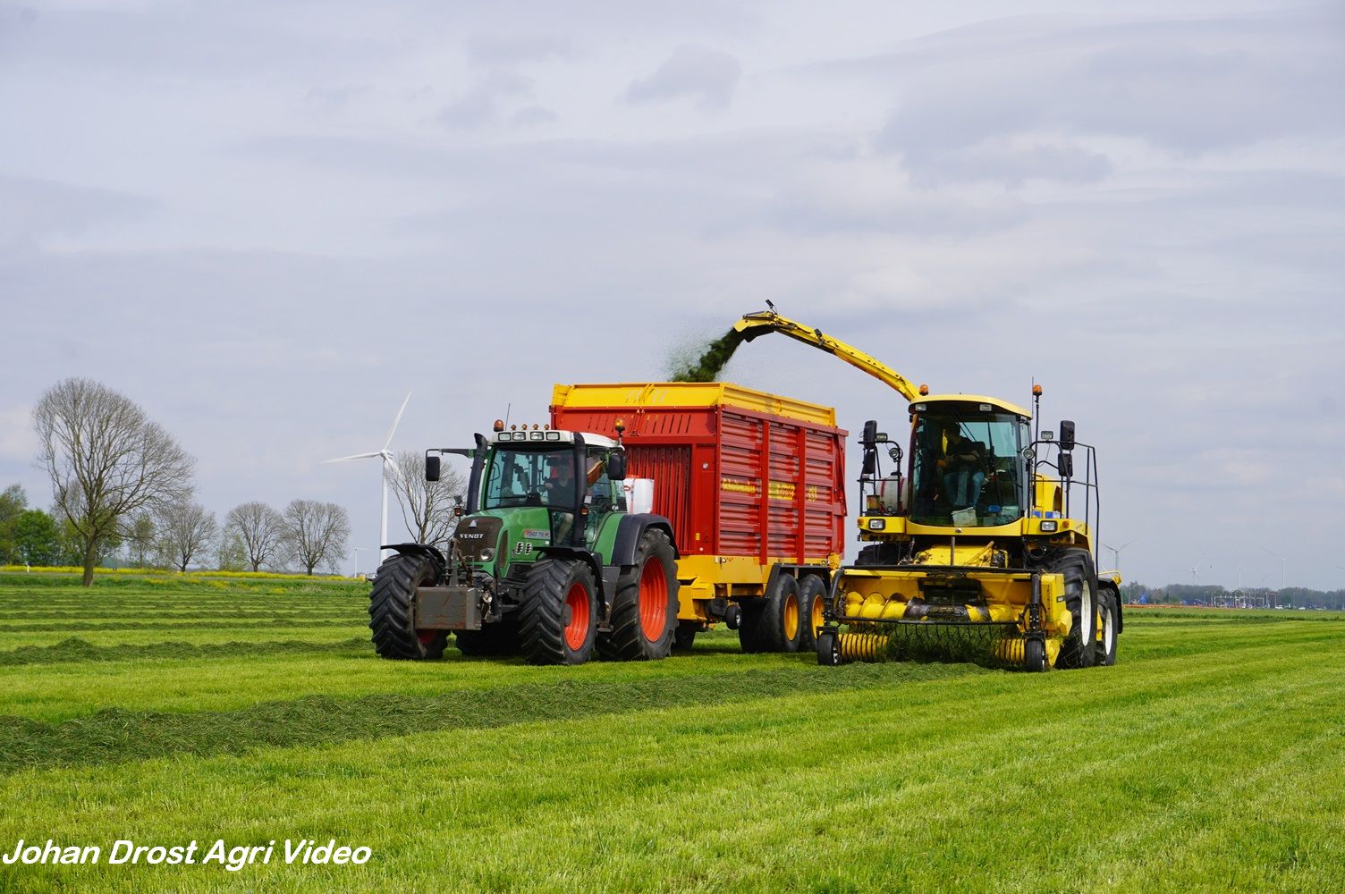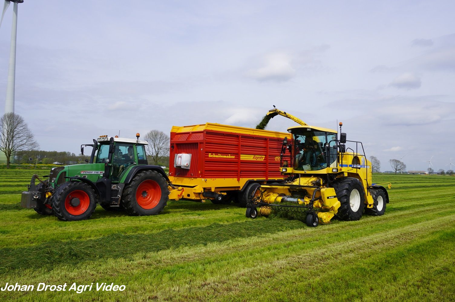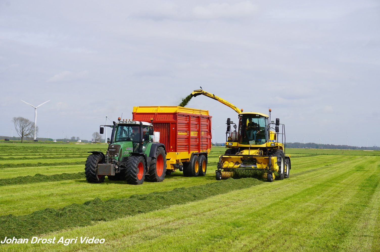 Loonbedrijf Johan Frens uit Hulshorst aan het gras hakselen met een New Holland FX50, Fendt 716 Vario TMS en Fendt 724 Vario met Schuitemaker Rapide 155.