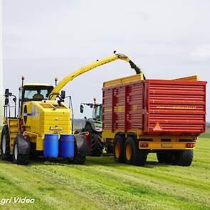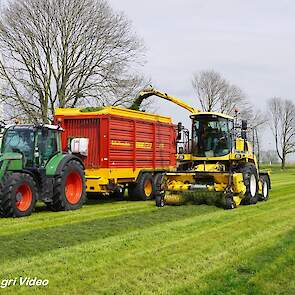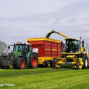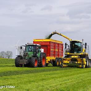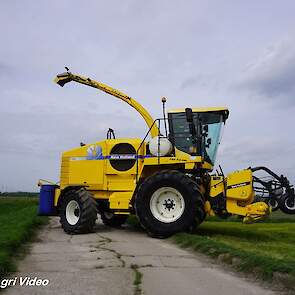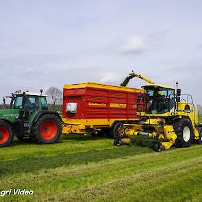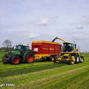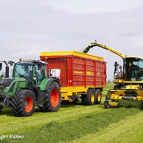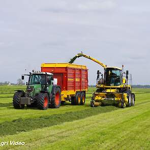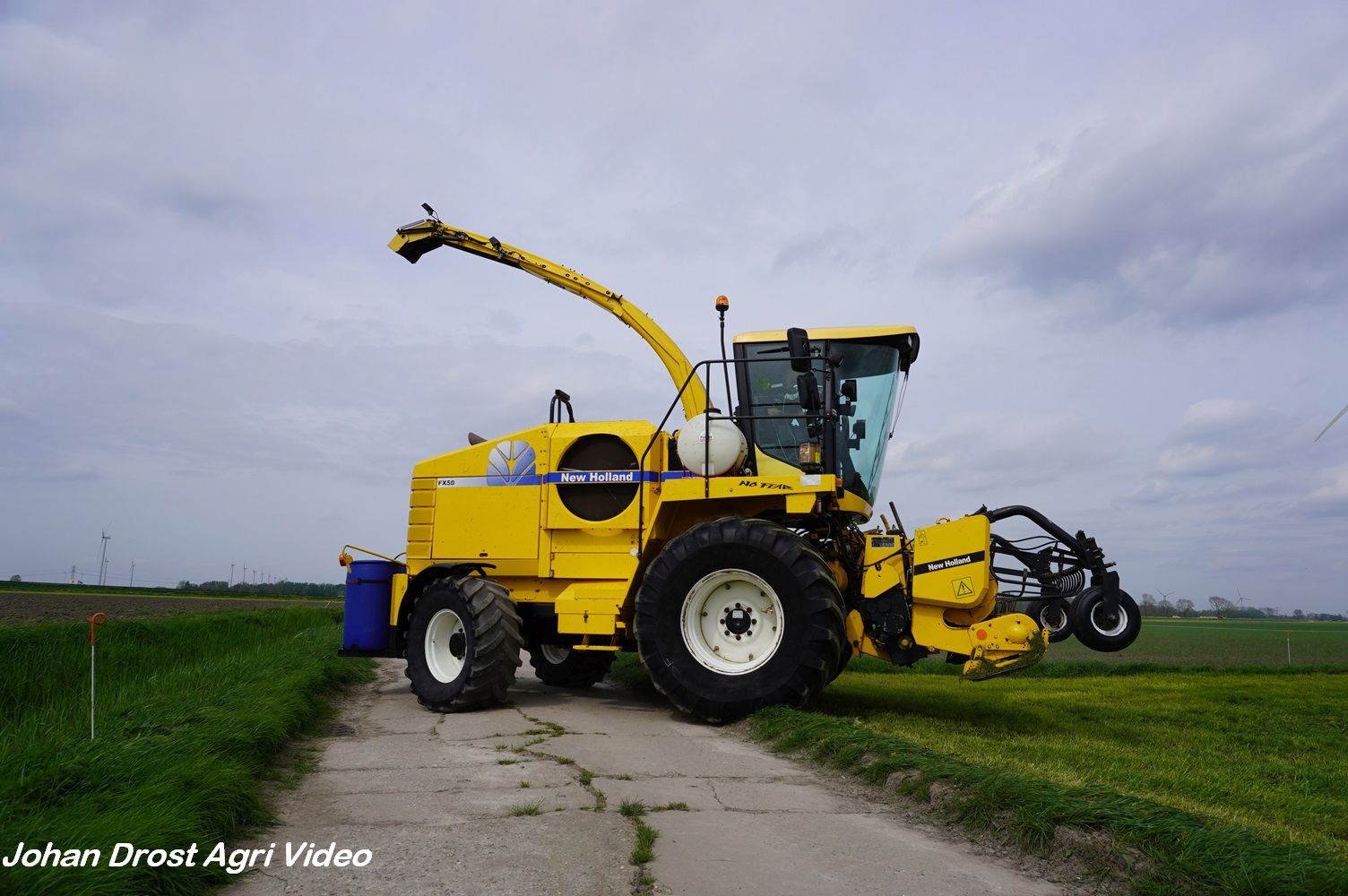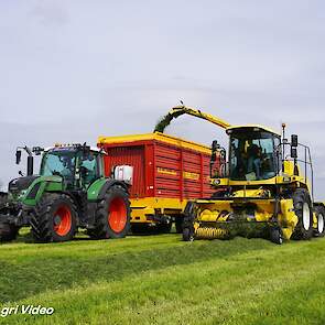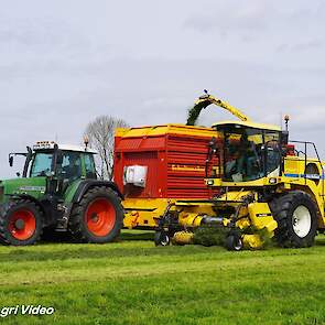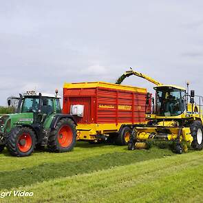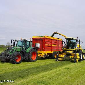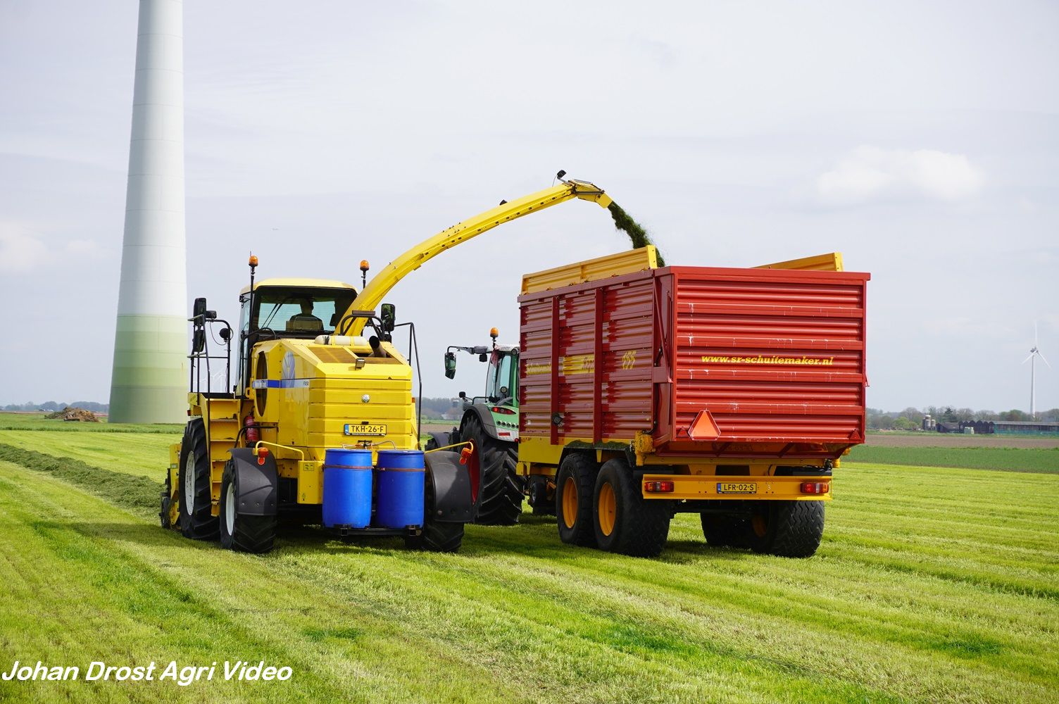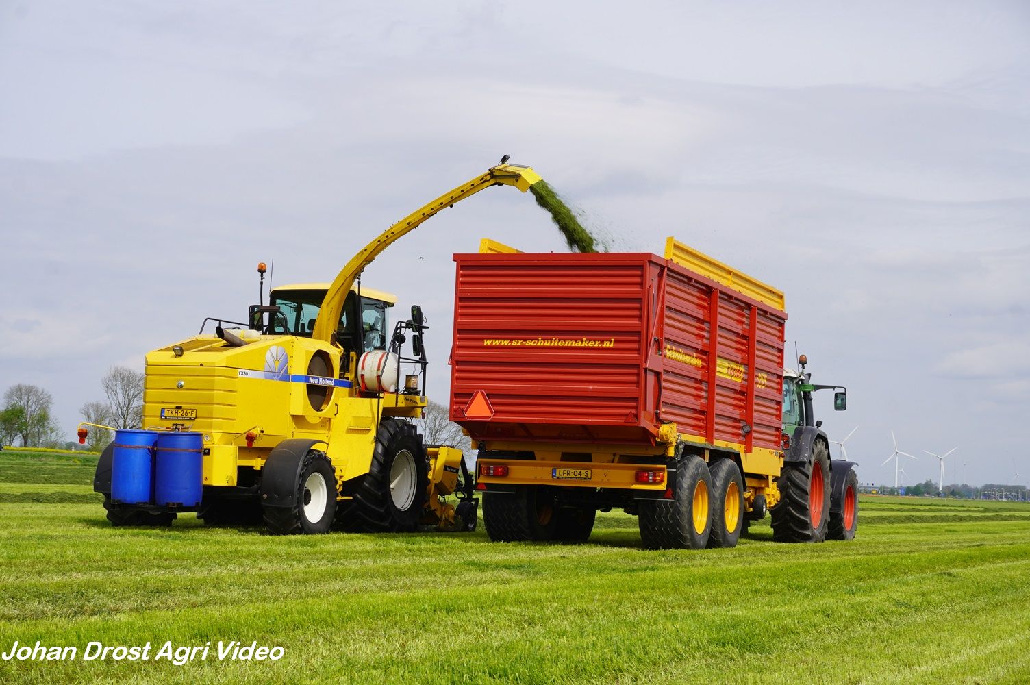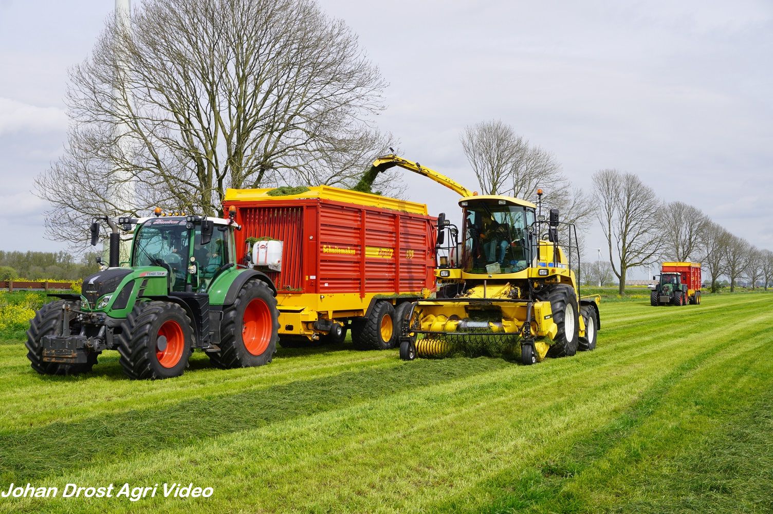 Loonbedrijf Johan Frens uit Hulshorst aan het gras hakselen met een New Holland FX50, Fendt 716 Vario TMS en Fendt 724 Vario met Schuitemaker Rapide 155.