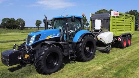 New Holland T7030 met Claas Cargos 8400-opraapwagen.Agrarische dienstverlening W. Renkema zorgt voor het verdelen en aanrijden van de kuilbult met een Fendt 818. In de fronthef een Holaras-kuilverdeler en achterin een Holaras-verdichtingswals.25 juni 2022Machines & Werktuigen