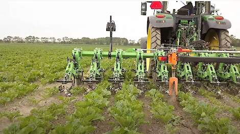 Exact schoffelen in de tuinbonen met Steketee EC-WeederSchoffelen in de bonen met de Steketee EC-Weeder op zware kleigrond in de Flevopolder 7 juli 2021Steketee