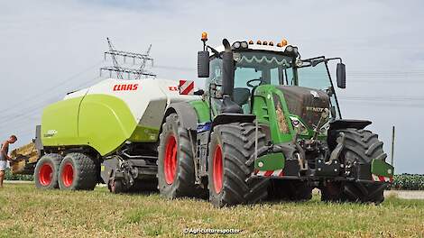 Stropakken persen met Fendt 828 VarioStropakken persen in Dronten (FL) met een Fendt 828 Vario en een Claas Quadrant 5200RC-balenpers van landbouwbedrijf Jan Bakker15 augustus 2021Fendt