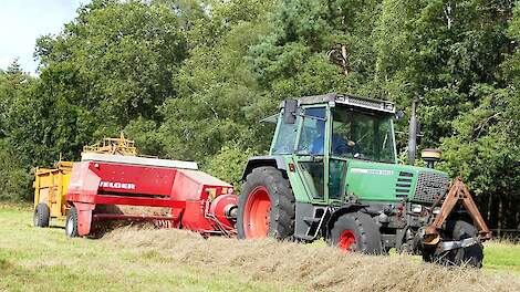 Fendt Farmer 308 LS met Lely Welger AP 730 en Hack SK 24 PMelkveebedrijf Overeem (Boerderij Meerhoeve) uit Staverden (gem. Ermelo, GD) aan het hooibalen persen15 september 2021Fendt