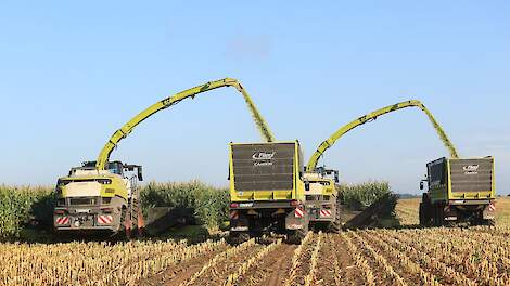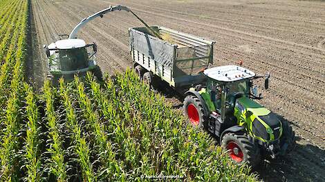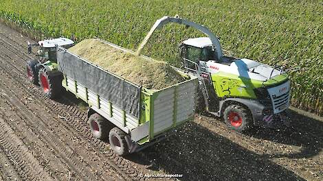 Claas Jaguar 960 in de maïsMaïs hakselen met een Claas Jaguar 960 van Akker-/ loonbedrijf B. Hut uit Zeewolde. Het transport werd gedaan met een Fendt 722 Vario en een Claas Axion 830 met Kaweco Radium-silagewagens. De kuil werd aangereden met een Volvo L70H. 6 oktober 2025CLAAS
