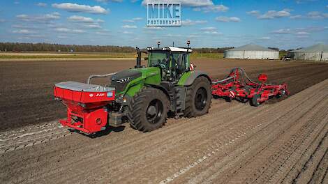Gebr. Hardeman uit Harskamp aan het aardappelen potenAardappelen poten met een Fendt 724 Vario en een Miedema CP 42 8 april 2020Fendt