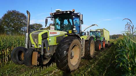 Maïs hakselen in Kootwijkerbroek met een New Holland FR600 van loon- en grondverzetbedrijf Nap VOF uit Ede (NLR Agri). Het transport werd gedaan met verschillende Valtra-tractoren met Schuitemaker-silagewagens.