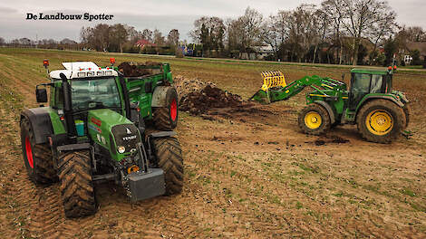 Vaste mest verspreiden met Fendt 820Een John Deere 6510 met voorlader vult de combinatie met de vaste mest 4 april 2020Trekkers